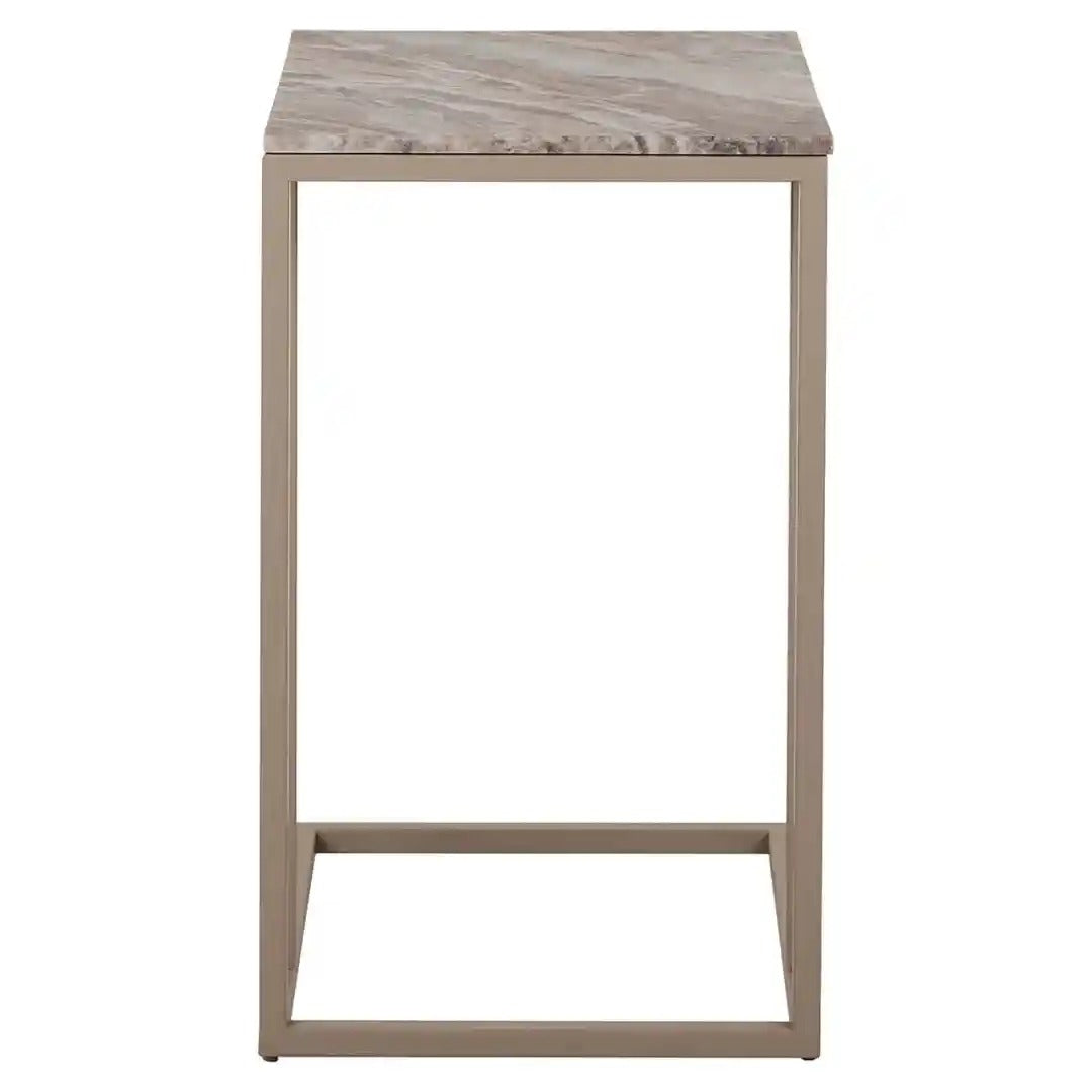 Elegant side table Fairfax with a marble top and C-shaped metal base is a practical and stylish addition to any interior. Thanks to its compact form and high base, you can easily slide it under a sofa or armchair, making it the perfect table for coffee, a book, or a laptop. The natural Toronto stone with its unique veining adds an exclusive character, while the powder-coated frame in a warm beige tone brings lightness and modernity.