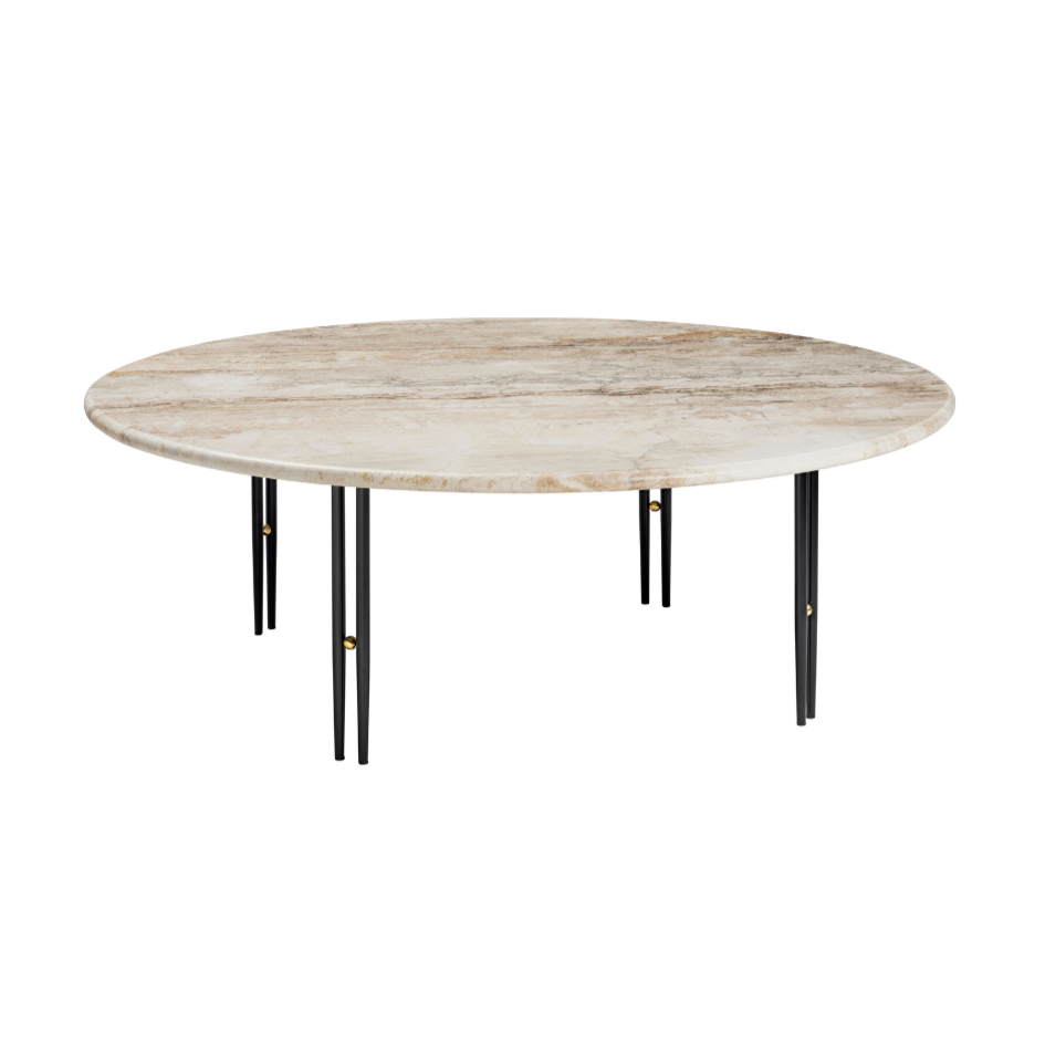 Coffee table IOI is a tribute to Italian material tradition and art déco, designed by the Danish-Italian duo GamFratesi. The distinctive shape of the base, consisting of double metal tubes connected by a brass ball, creates the letter rhythm I-O-I, from which the collection gets its name. The subtle, minimalist construction in a black satin finish and brass serves as a backdrop for the elegant top made of Rippled Beige travertine – a stone with a natural texture and warm hue.