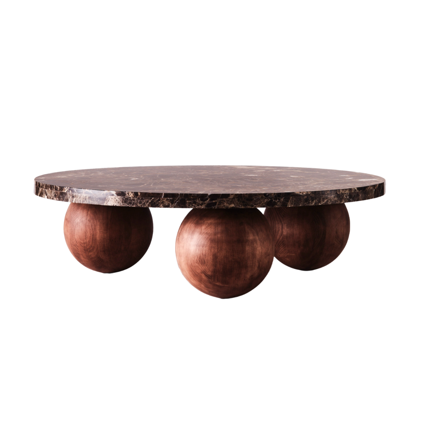 Coffee table Sphere is an extraordinary combination of simplicity in form and refined design. The solid top, 5 cm thick, made of Emperador marble in deep brown with light veining, rests on massive spheres of dark-stained beech wood. Each piece is unique, thanks to the natural differences in the structure and color of the stone.