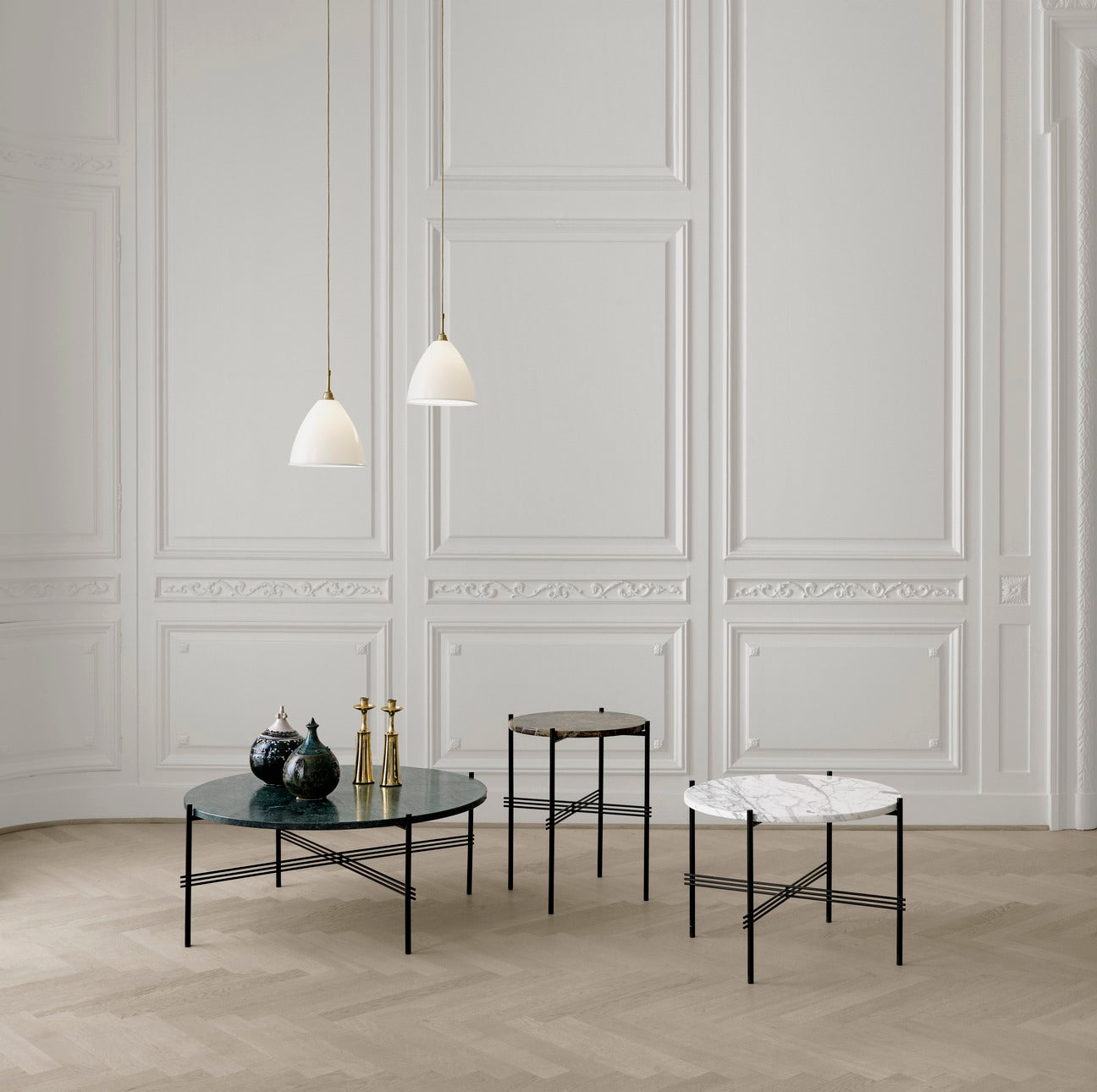 Coffee table TS is a classic of modern design by the Danish-Italian duo GamFratesi. Originally designed for the Copenhagen restaurant The Standard, it combines elegant lightness with striking geometry. The slender legs with a distinctive crisscross detail create a subtle yet solid structure, complemented by a round top made of marble, travertine, or glass – in various colors and finishes.