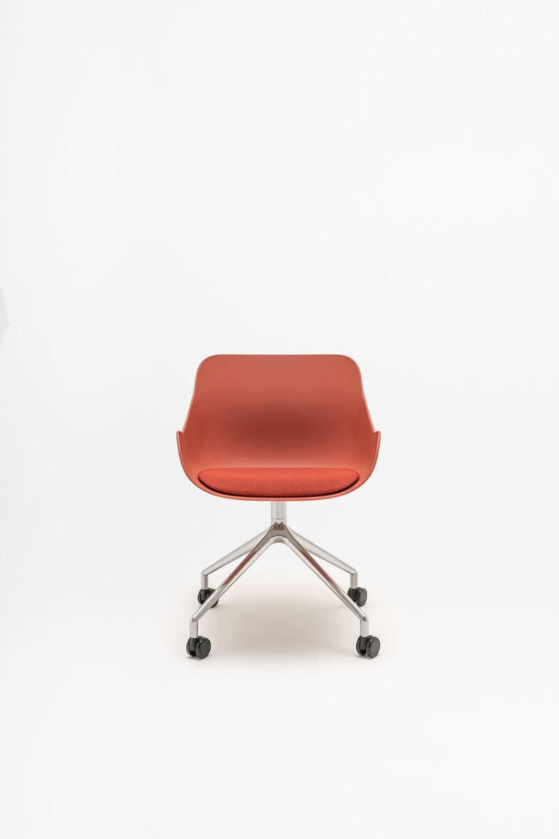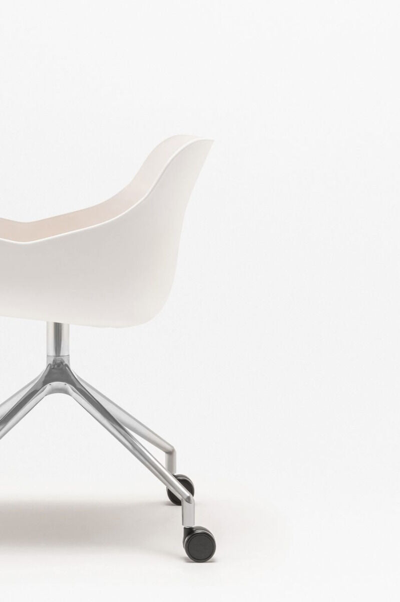 Swivel chair Baltic Remix, designed by Krystian Kowalski, is a modern piece of furniture ideal for offices, conference rooms and educational spaces. The polished aluminum base and a colorful seat bring positive energy into the interior. The bucket seat with a soft upholstered pillow and integrated armrests ensures comfort, and the rotating base on optional wheels increases mobility and productivity.