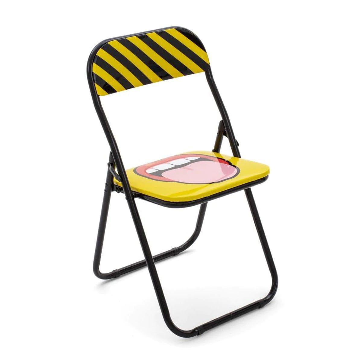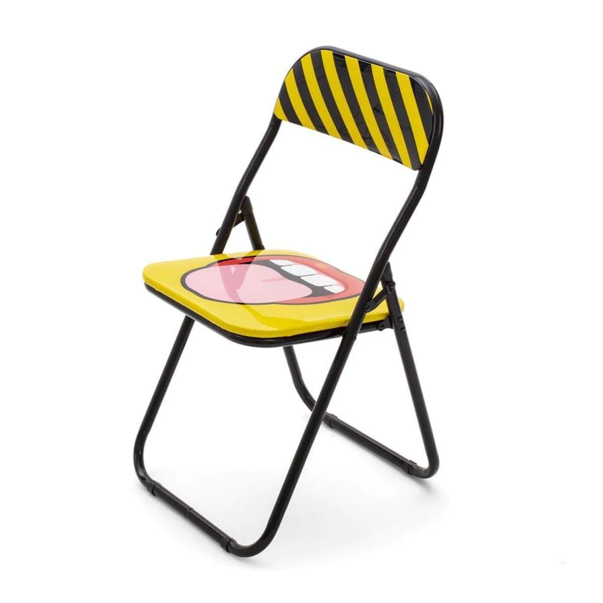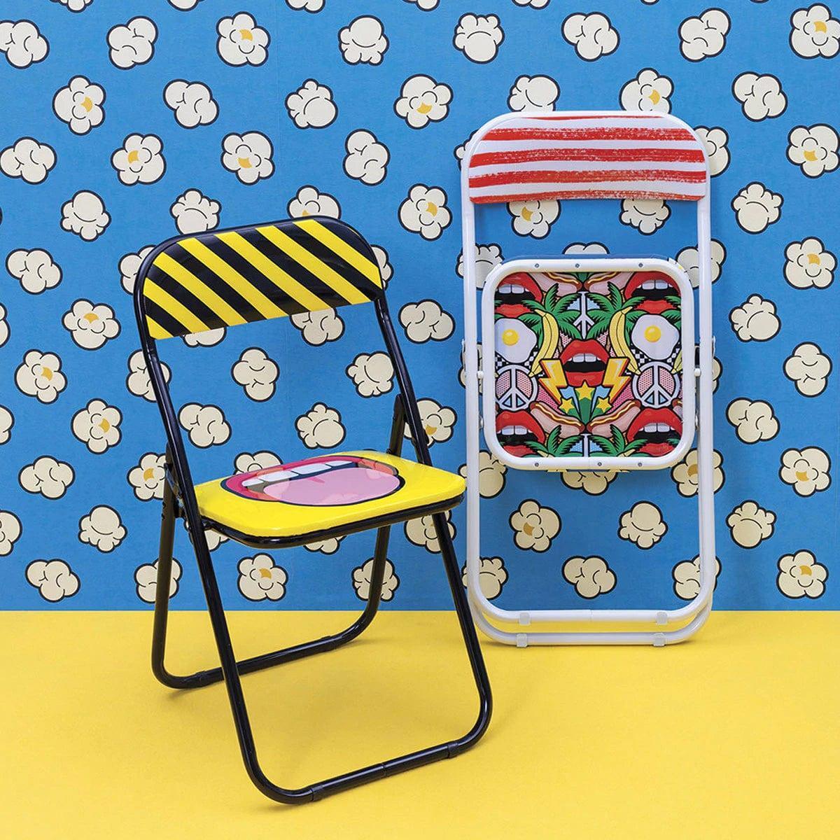 Designer folding chair In the style of pop art, it will give the interior a bit surreal and funny character. The whole is made of metal, and the dynamism full of dynamism and a slightly controversial collage create an original work of art.