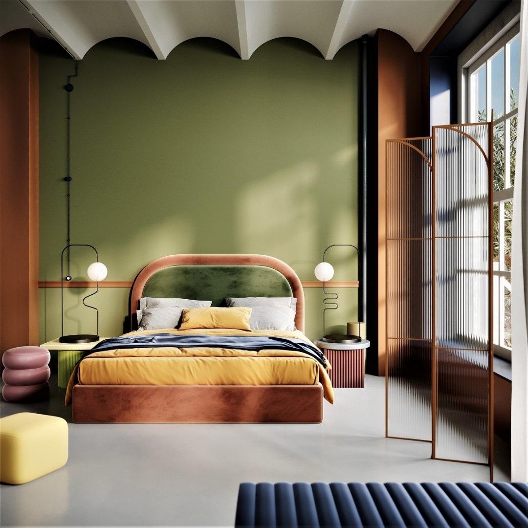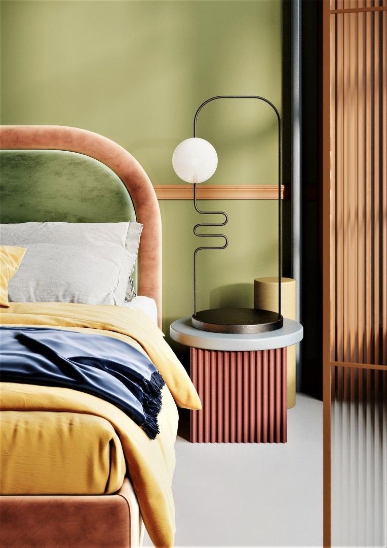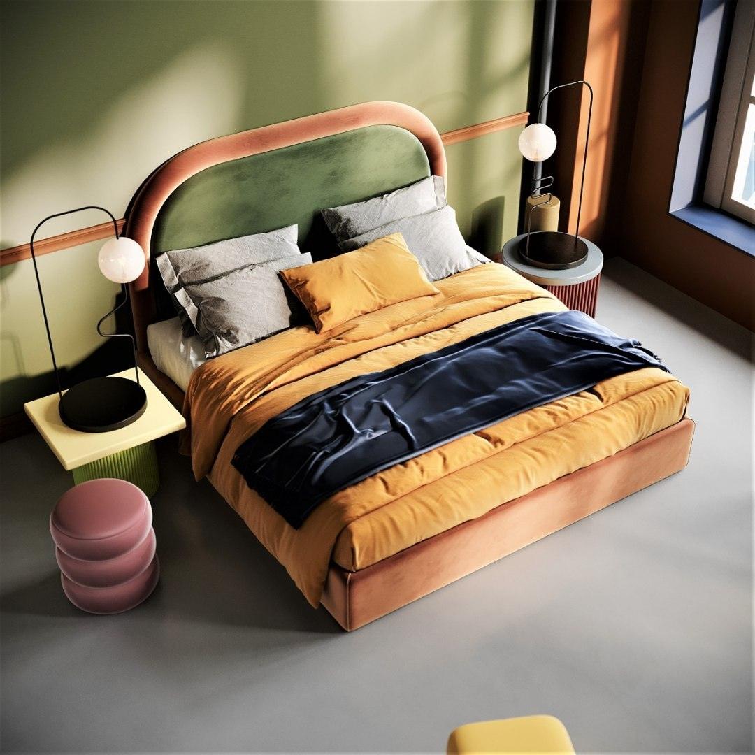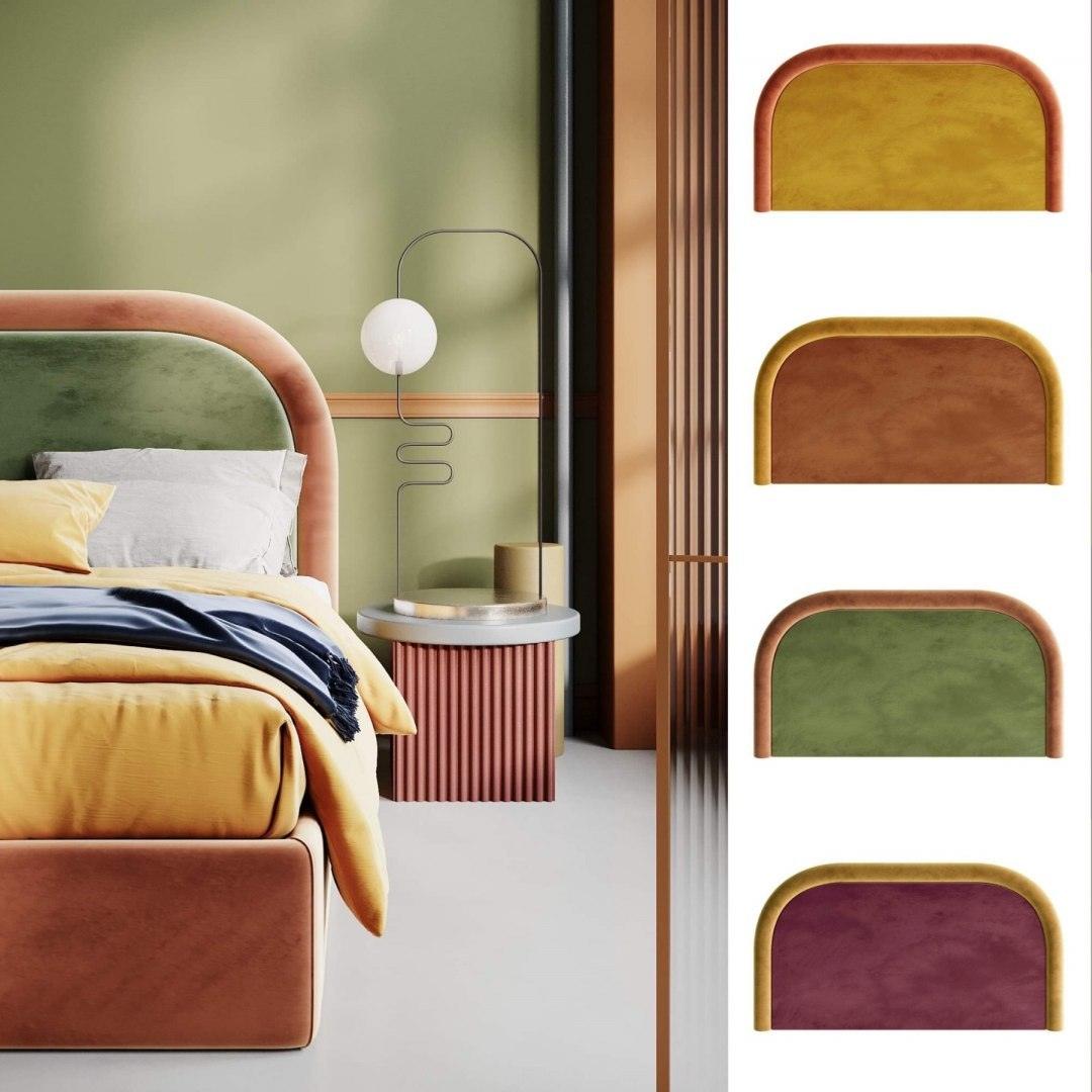Oryginalne łoże z miękkim, tapicerowanym wezgłowiem. Kompozycje brył nawiązują do popularnego w latach 80. postmodernistycznego stylu Memphis.