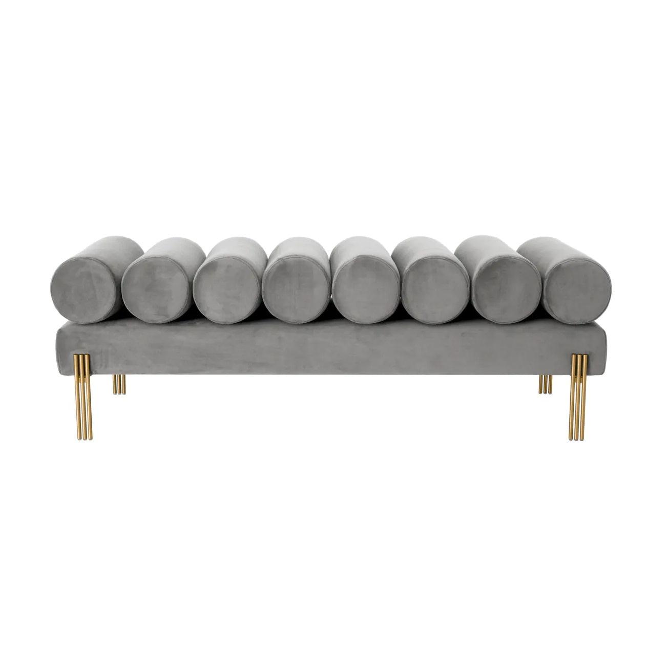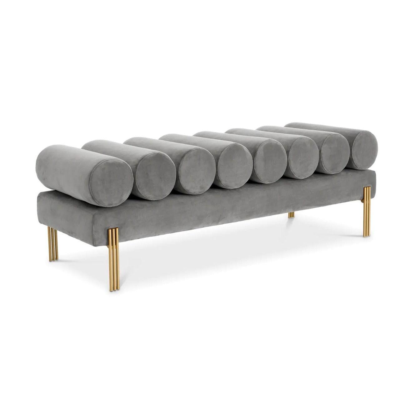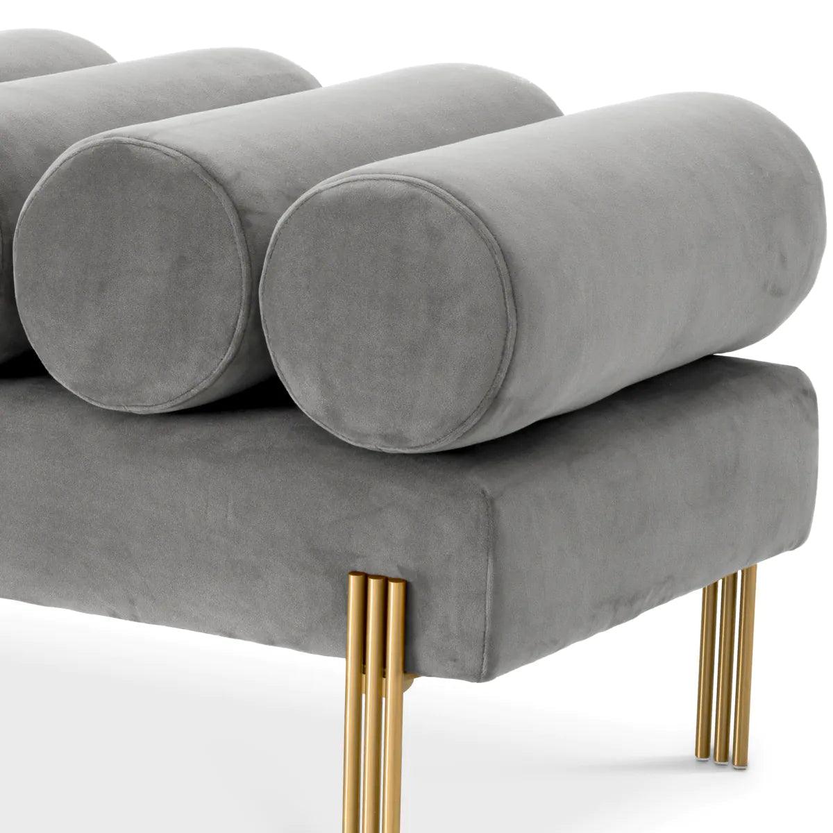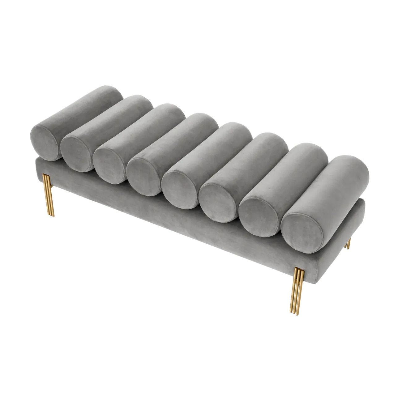 The brushed brass finish adds designer bench a sophisticated, elegant accent that perfectly complements the deep shade of gray velvet. This design, inspired by the aesthetics of the 1950s, will catch the attention of every guest and add a unique character to your interior.