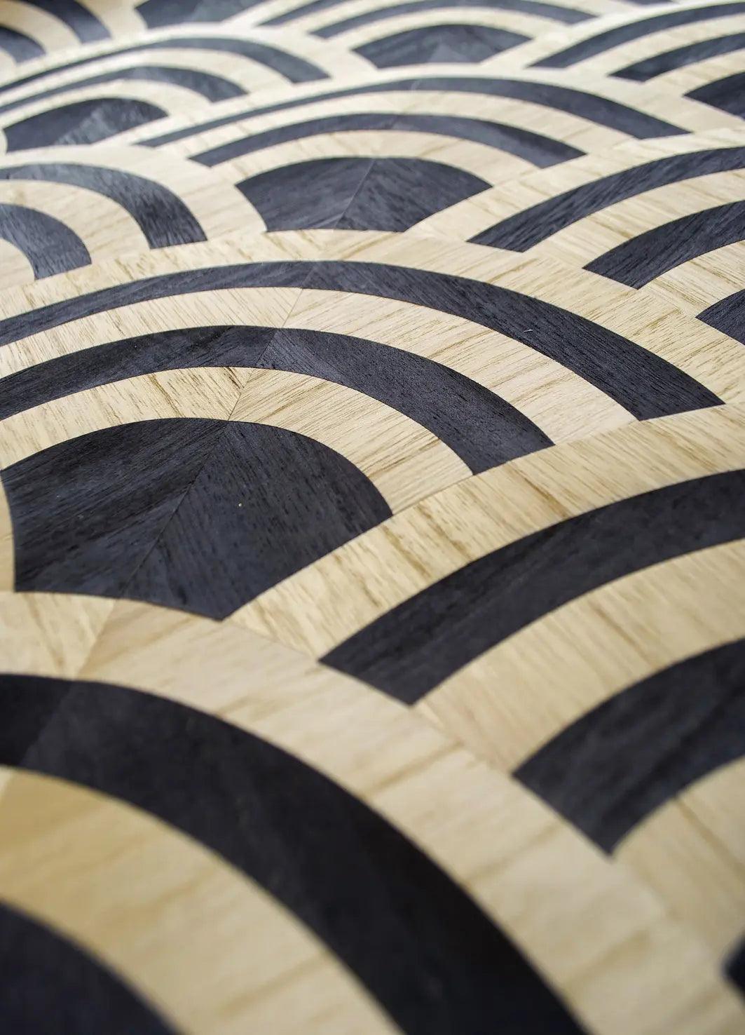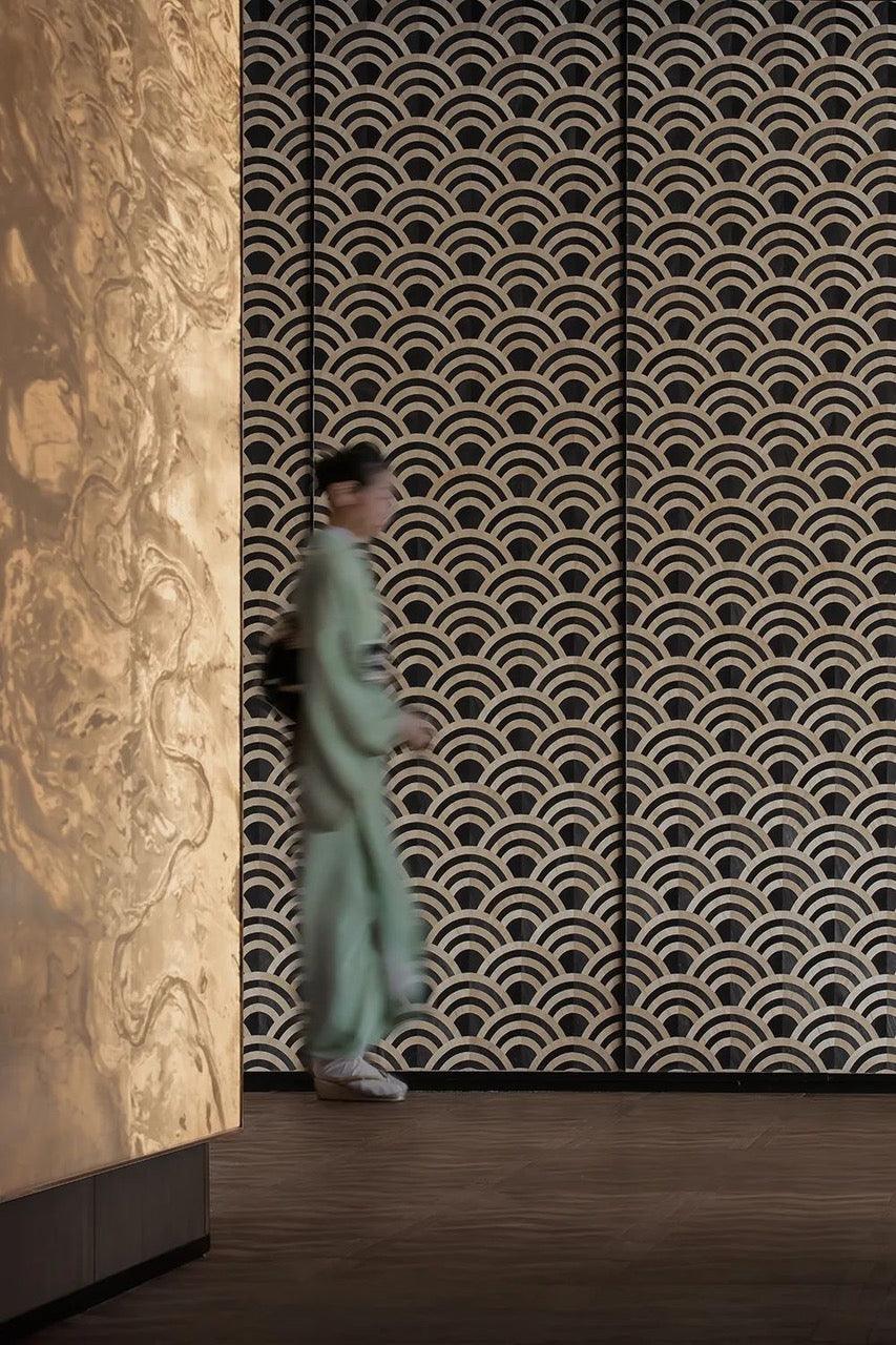 Wallpaper Lucky O's, made of wooden veneer inlays, presents the overlapping letters "O", which resemble the rolling waves of the ocean. The unique pattern of wallpaper, inspired by the ancient SEIGAIHA motif, symbolizing water waves, represents happiness, strength and endurance. Lucky O's is available in four colors.
