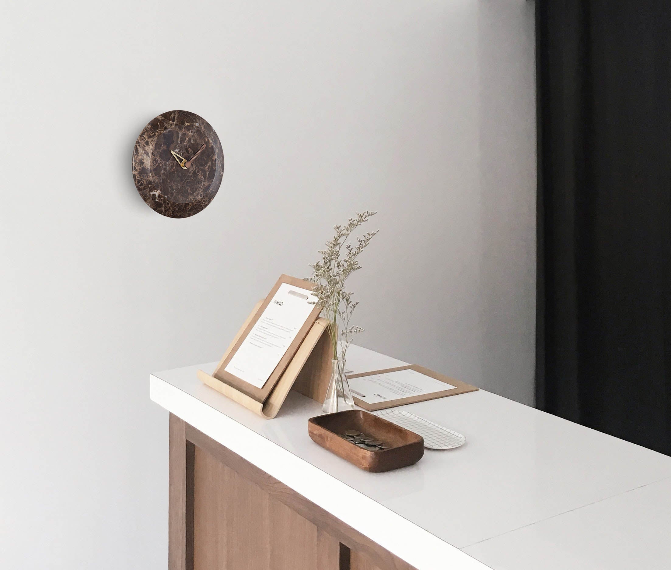 Wall Clock Bari is an elegant proposal where natural stone takes center stage. This clock features a dial made from Emperador marble, making each piece unique. The combination of marble with walnut wood and polished brass gives the marble wall clock Bari a sculptural character, transforming it into a refined decoration for the living room, dining room, or study.