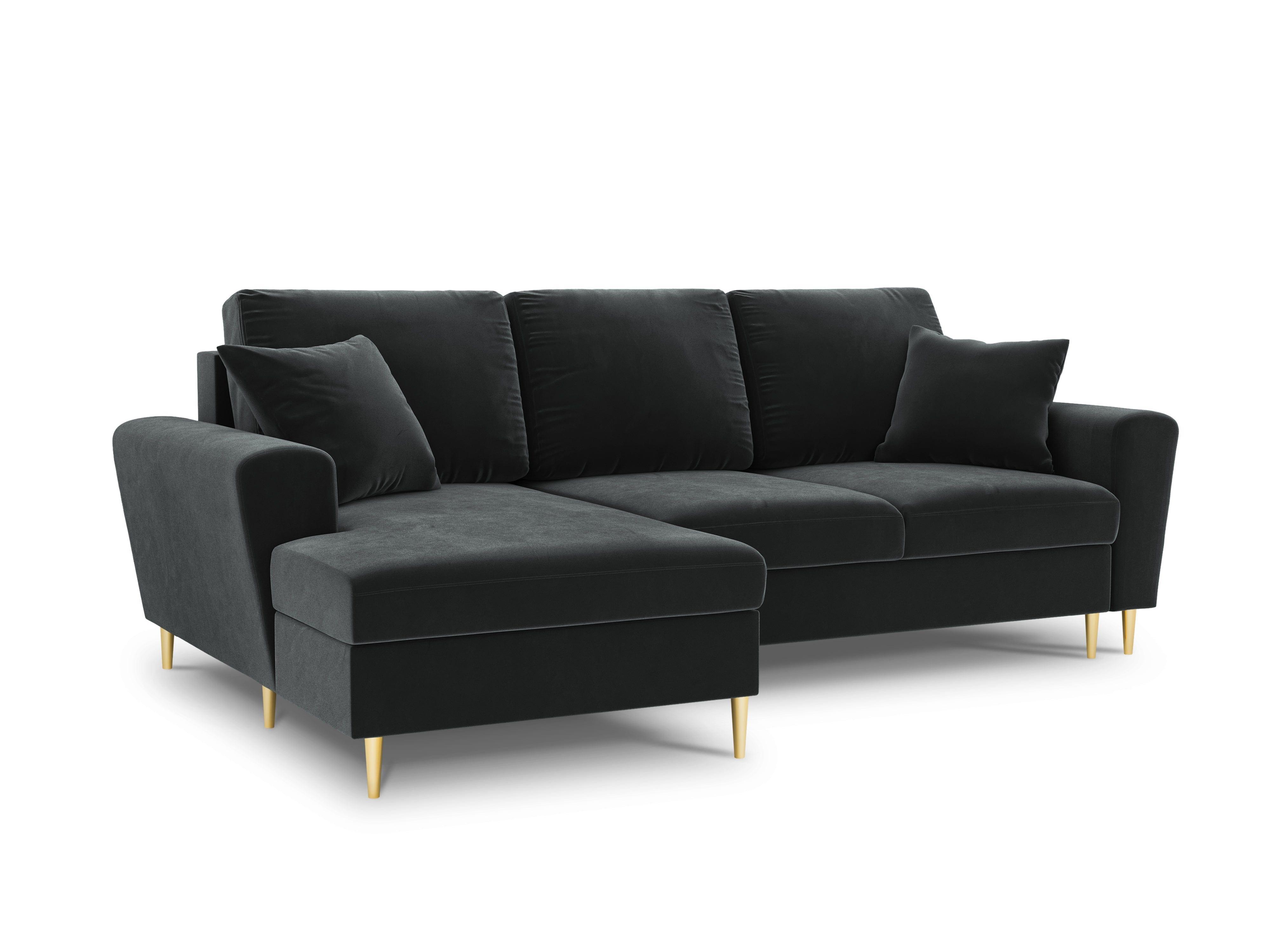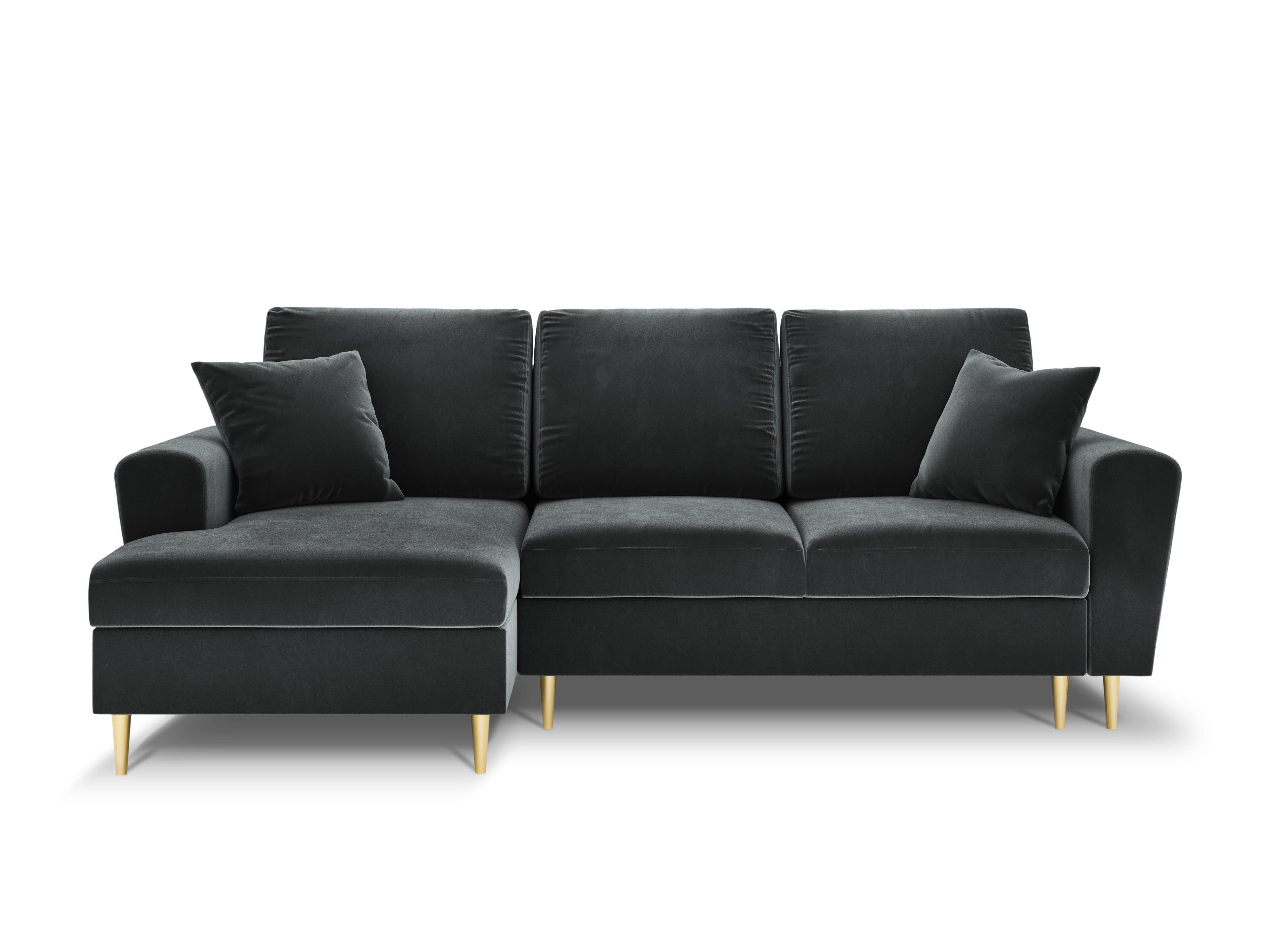 Donkergrijze linkszijdige fluwelen hoekbank met slaapfunctie KYOTO en gouden basis