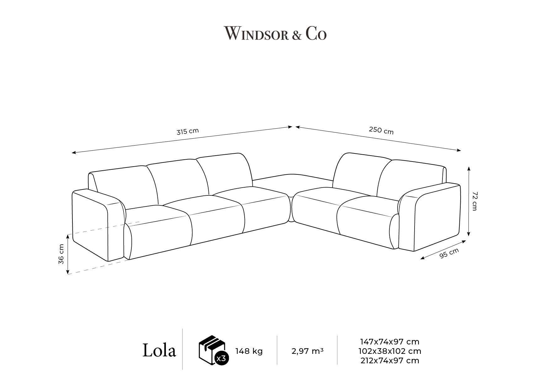 De indrukwekkende afmetingen en functionele vorm zorgen ervoor dat de hoekbank Lola het centrale punt van elke ruimte wordt, met voldoende ruimte om te ontspannen voor het hele gezin of een groep vrienden.
