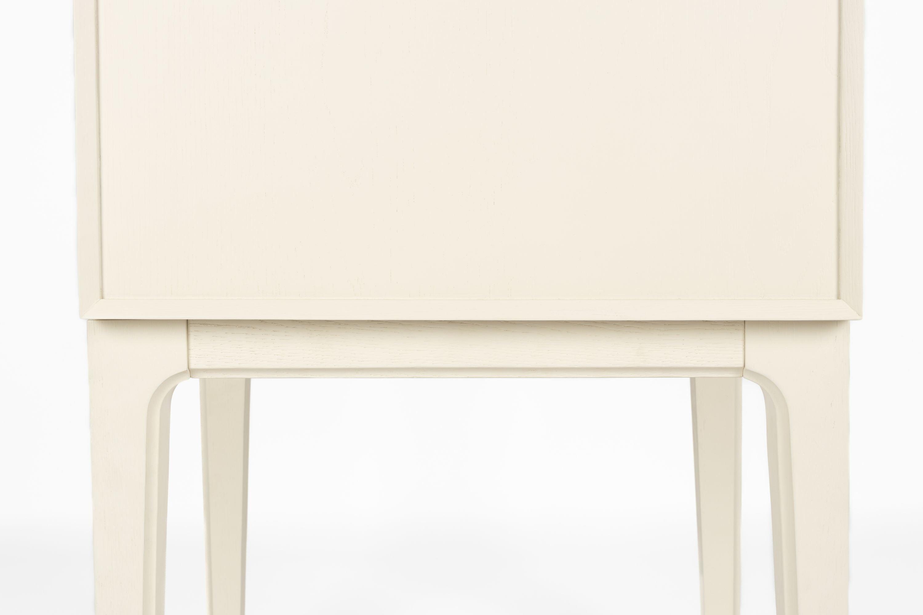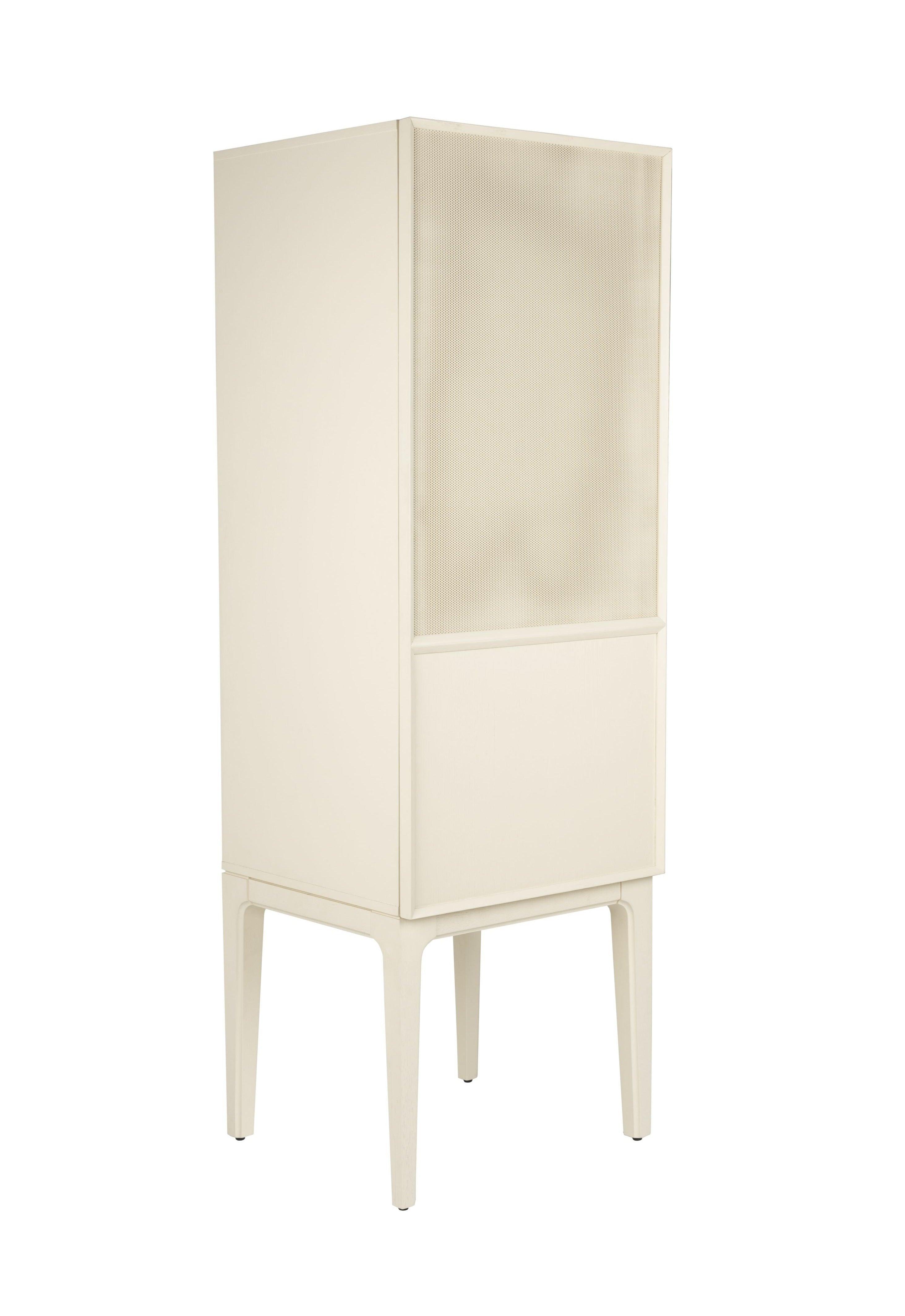 De afwerking in crèmekleur accentueert prachtig de natuurlijke tekening van de eikenhouten nerf. De metalen, opengewerkte deuren hebben opvallende panelen. De verhoogde poten geven de kast een lichte uitstraling.