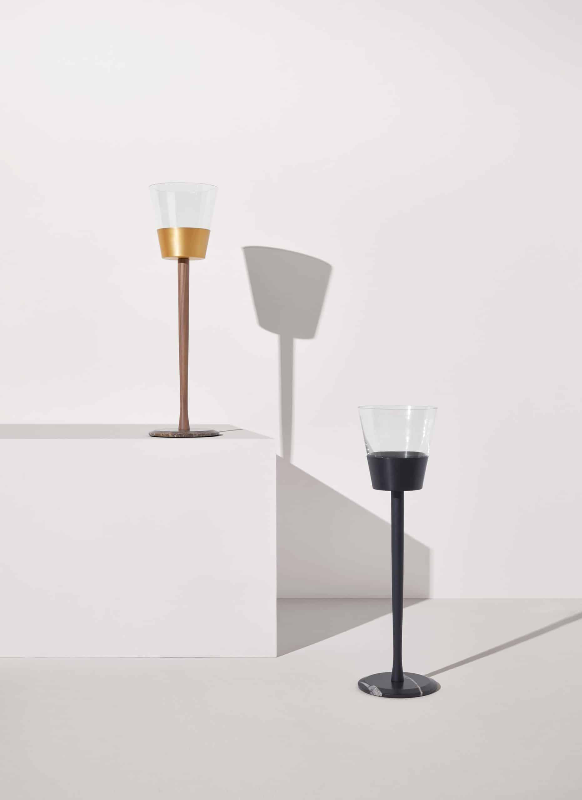De glazen ijsemmer is geplaatst in een geanodiseerde aluminium kelk, ondersteund door een slanke voet van zwartgekleurd massief essen. De stabiele marmeren basis geeft de constructie een nobele uitstraling en duurzaamheid. Dit exclusieve champagnekoeler op een standaard combineert marmer, hout en metaal in een harmonieuze, moderne compositie. Perfect als staande koeler voor wijn en champagne tijdens feesten, diners en bijzondere gelegenheden.
