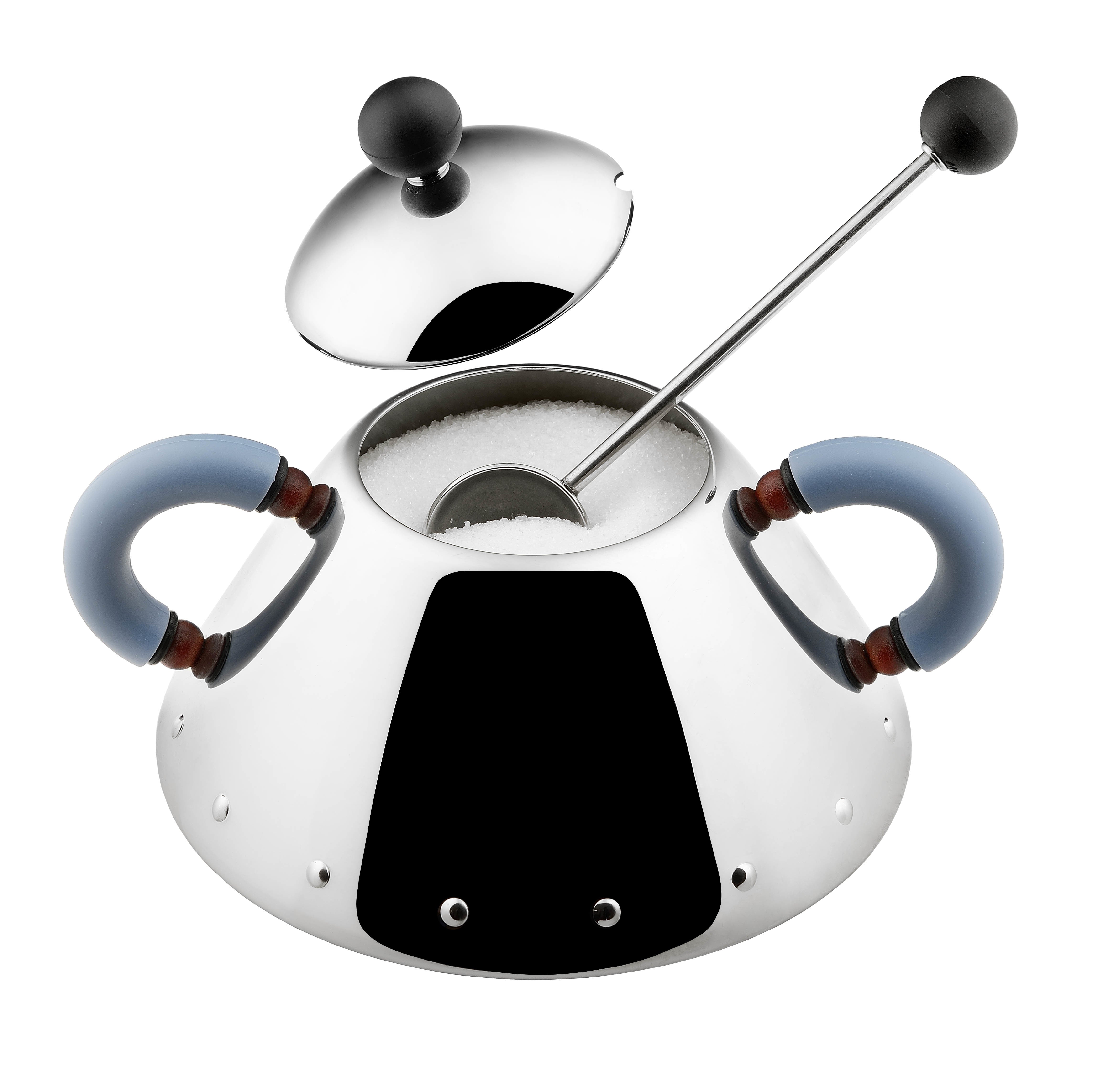 Suikerpot 9097 is een icoon van stijl, ontworpen door Michael Graves. Gemaakt van gepolijst roestvrij staal, verrast het met zijn conische vorm en handvatten in een delicate blauwe kleur, die elegantie en gebruiksgemak toevoegen.