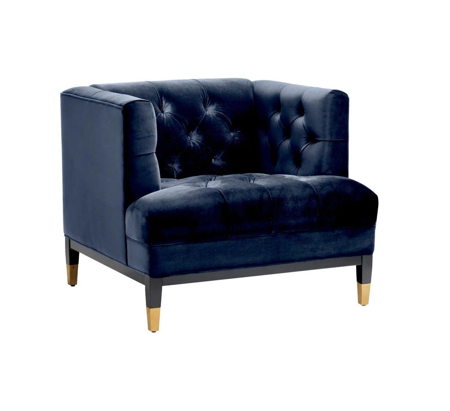 De diepe, fluwelen bekleding Savona in marineblauw, versierd met kenmerkende knopen, voegt diepte en karakter toe aan de fauteuil. Elke knop, elke naad is zorgvuldig ontworpen en vervaardigd om het luxueuze karakter van het meubel te benadrukken. De zwart-messing poten completeren het geheel en voegen moderniteit en elegantie toe aan de fauteuil.