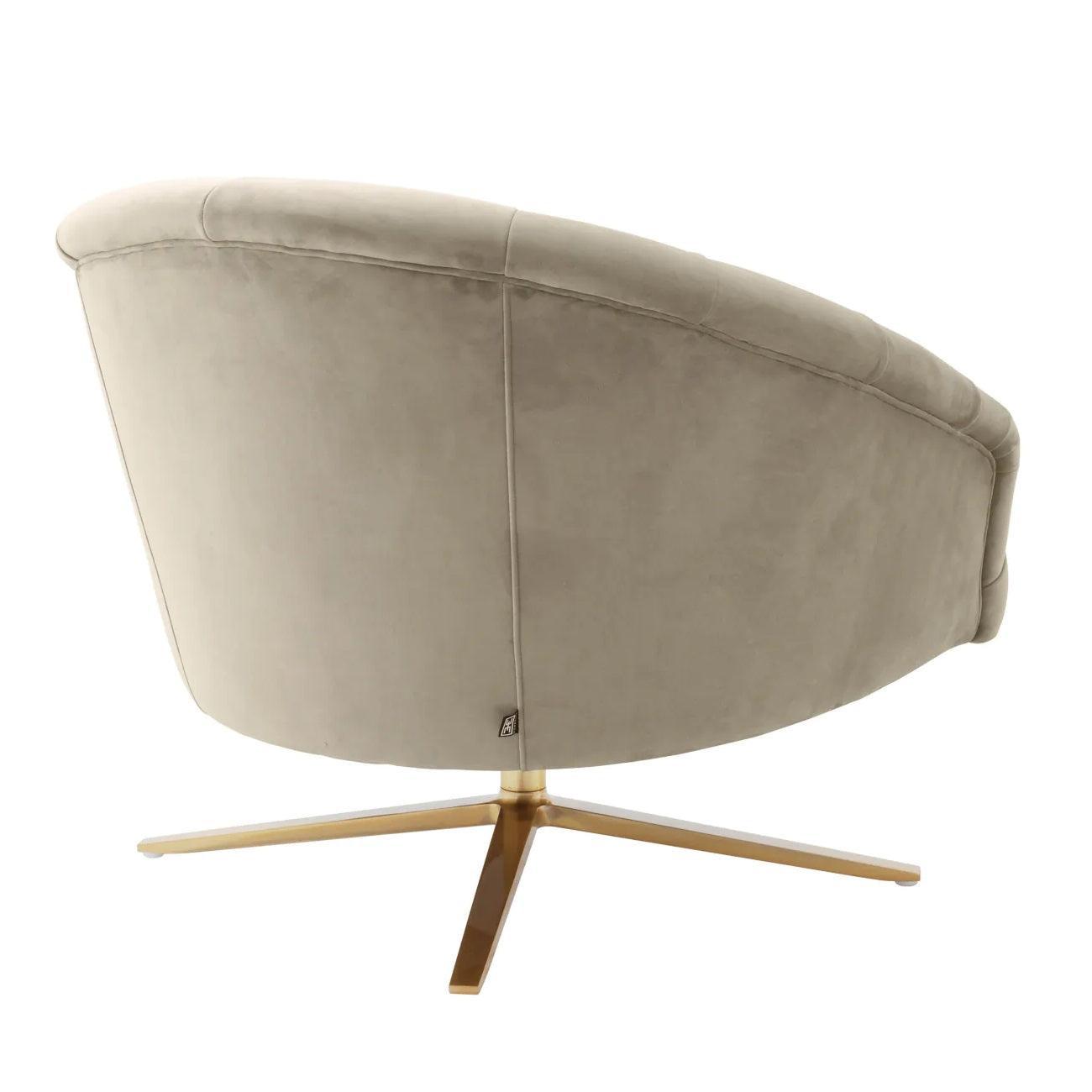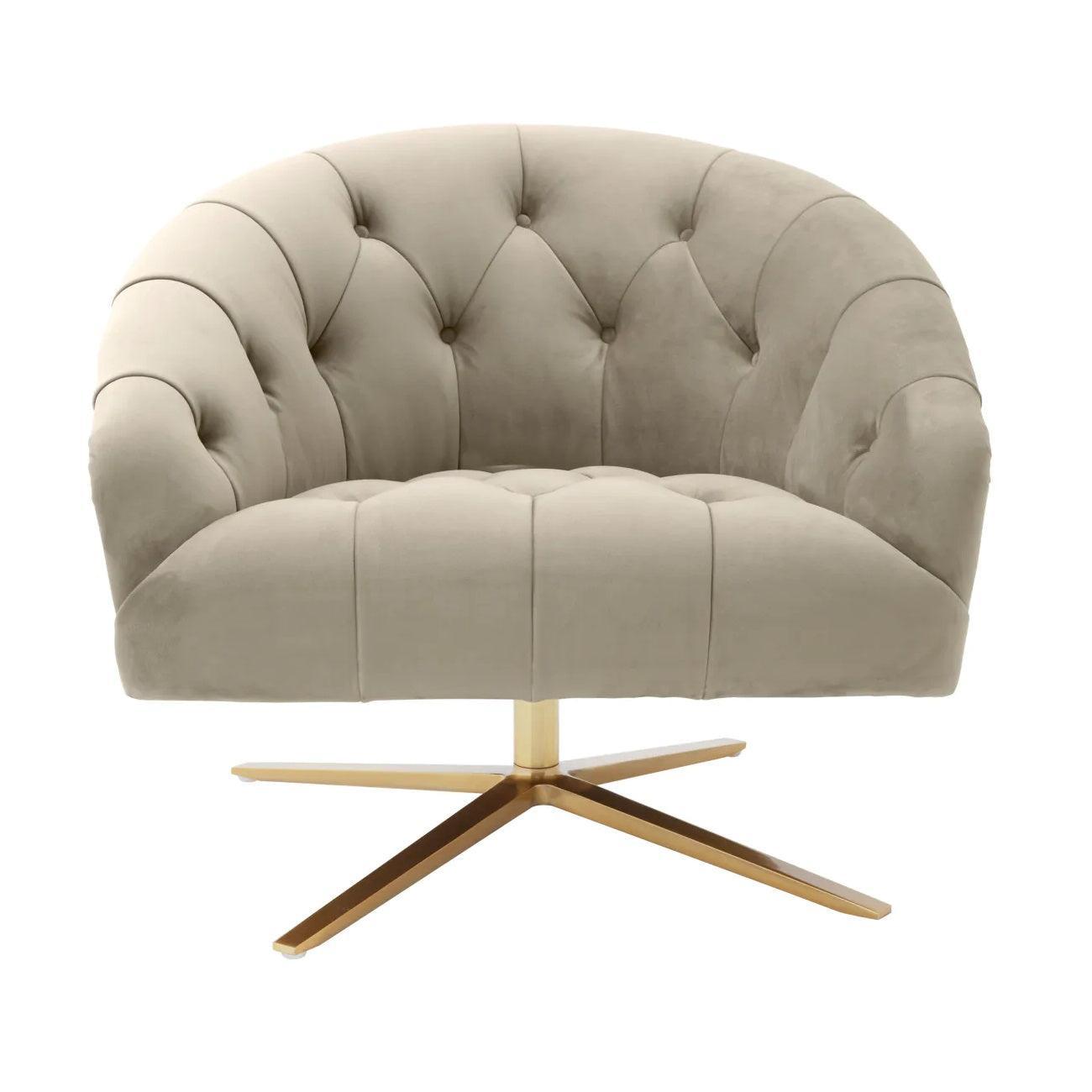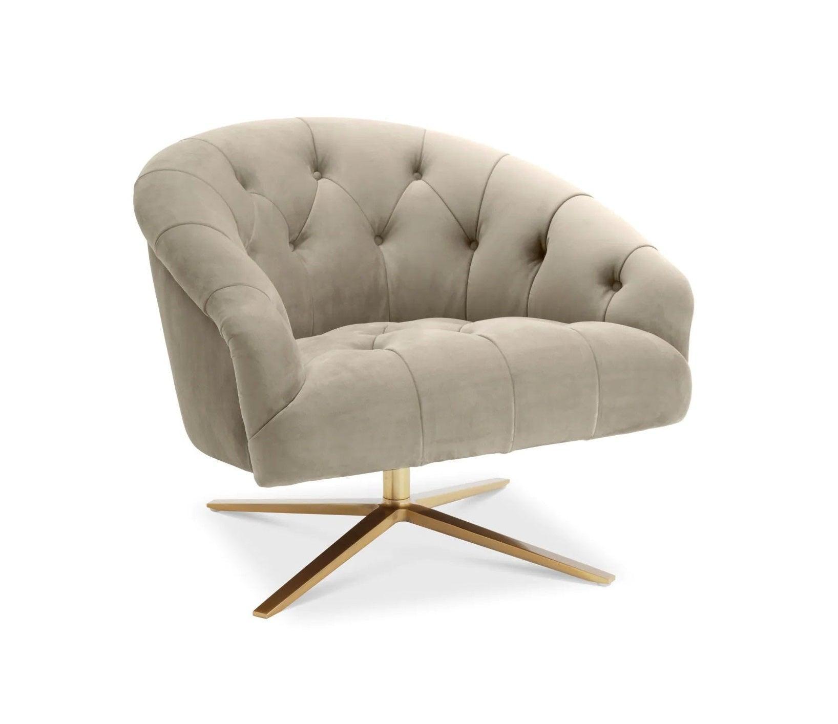 Bovendien getuigt het stevige frame van de beige stoel, dat is uitgerust met een draaibare basis in de vorm van een kruis, van de zorgvuldige afwerking van elk, zelfs het kleinste detail. De afwerking in geborsteld messing voegt karakter en een zekere nobelheid toe, waardoor de designstoel Gardner niet alleen comfortabel is, maar ook een uiterst stijlvolle aanvulling op elk interieur vormt.