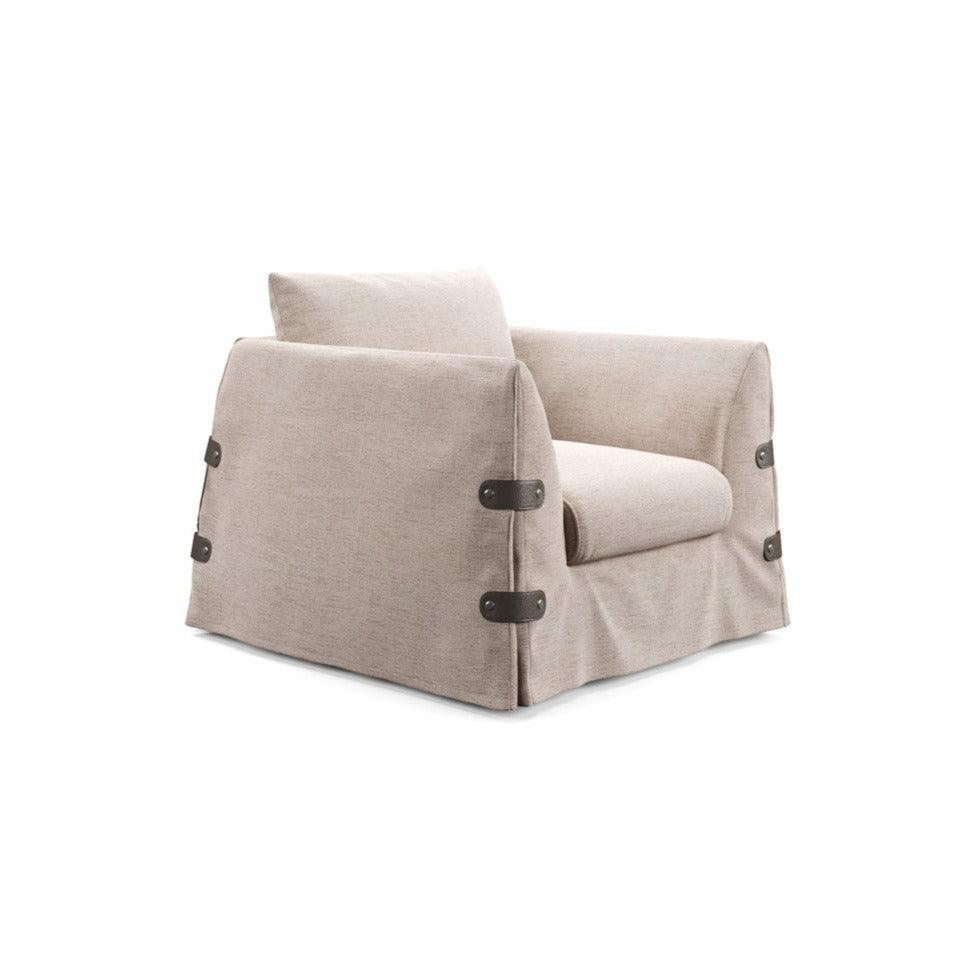 Een kenmerkend element van deze fauteuil zijn de contrasterende strepen, die zijn gedefinieerd door de knopen die de hoes op de armleuningen bevestigen. Dit detail, dat doet denken aan een martingale van jassen, geeft de fauteuil een unieke en heldere uitstraling, die de diversiteit van persoonlijkheden perfect weergeeft.