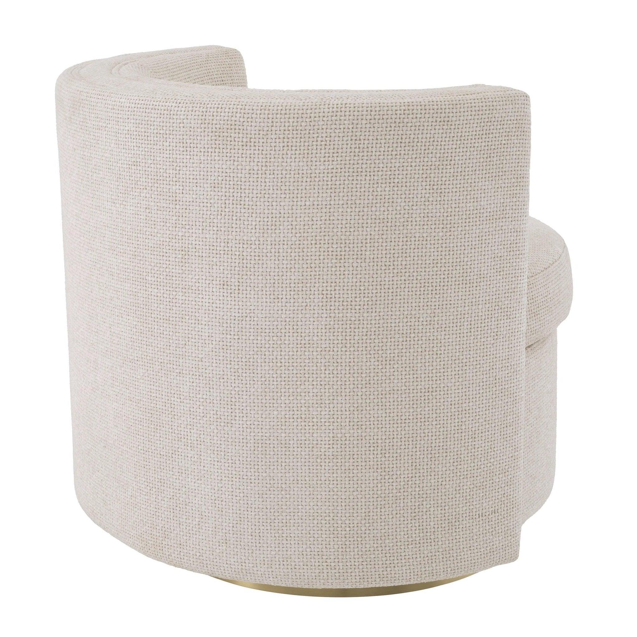 Draai fauteuil Amanda is als een symfonie voor de ogen, waarbij elk detail een belangrijke rol speelt in het creëren van harmonie. De gebogen rugleuning, als delicate vleugels van een vlinder, vloeit soepel over in de armleuningen en vormt een uniforme, organische vorm. De matte gouden afwerking van de basis voegt een koninklijke glans toe, terwijl de stof Amanda Lyssa in de kleur wit je omhult als een delicate sluier.