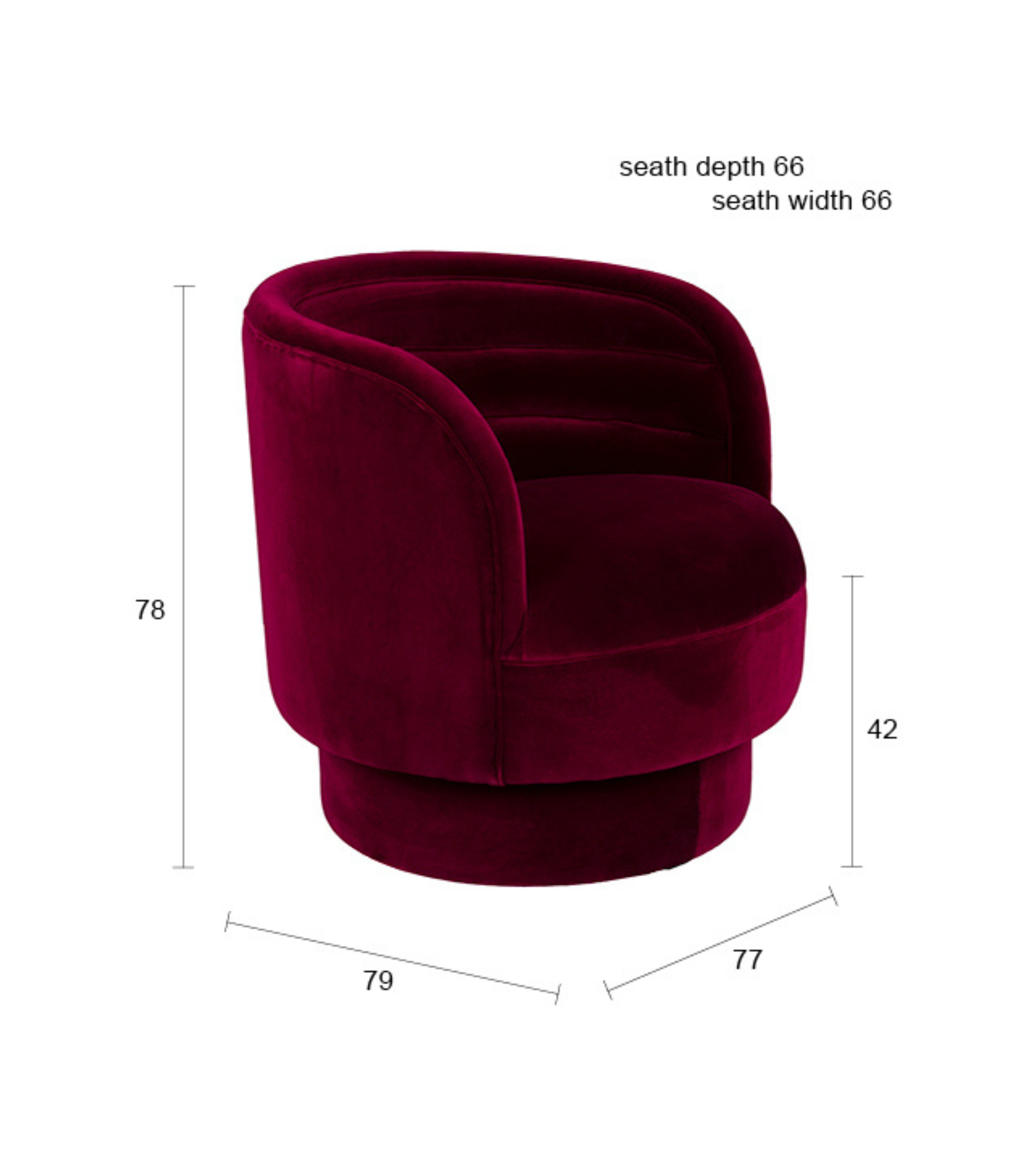 Breng een vleugje verfijnde vintage stijl in uw interieur met de fauteuil Dorothy. De ronde vorm en het fluwelen bekleding roepen de sfeer van de jaren '50 en '60 op, alsof het rechtstreeks uit een klassieke film uit die tijd komt. De diepe, rode stof en stijlvolle stiksels op de rugleuning voegen elegantie en gezelligheid toe, waardoor een sfeer ontstaat die doet denken aan een ouderwetse thuisbioscoop. Dit is de ideale keuze voor avonden met een boek of een film.