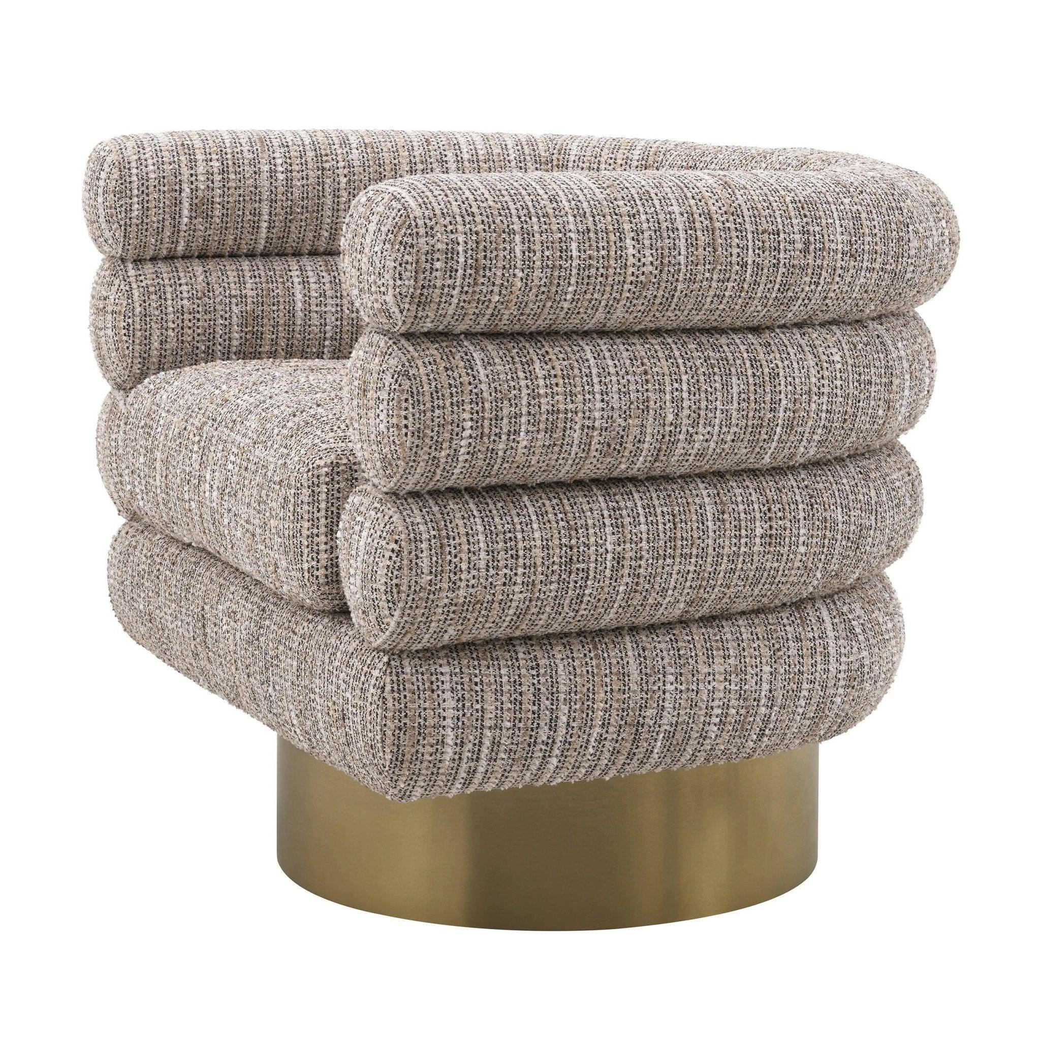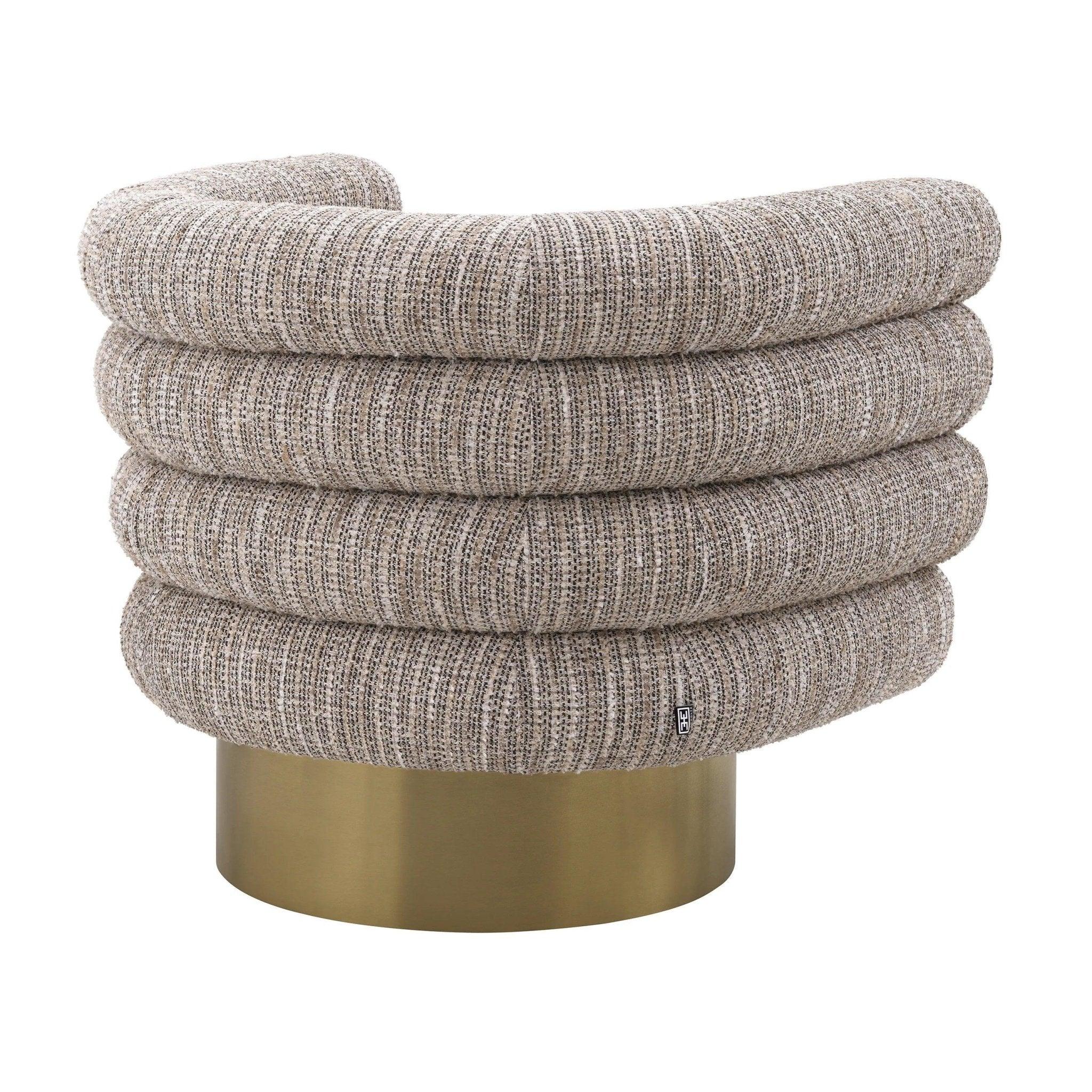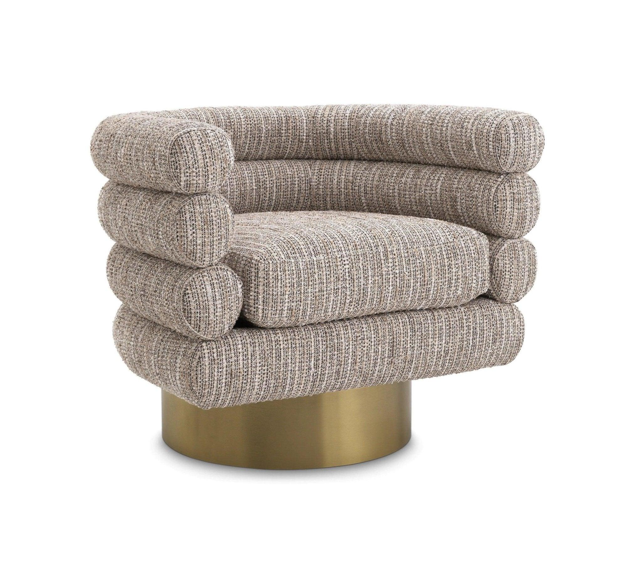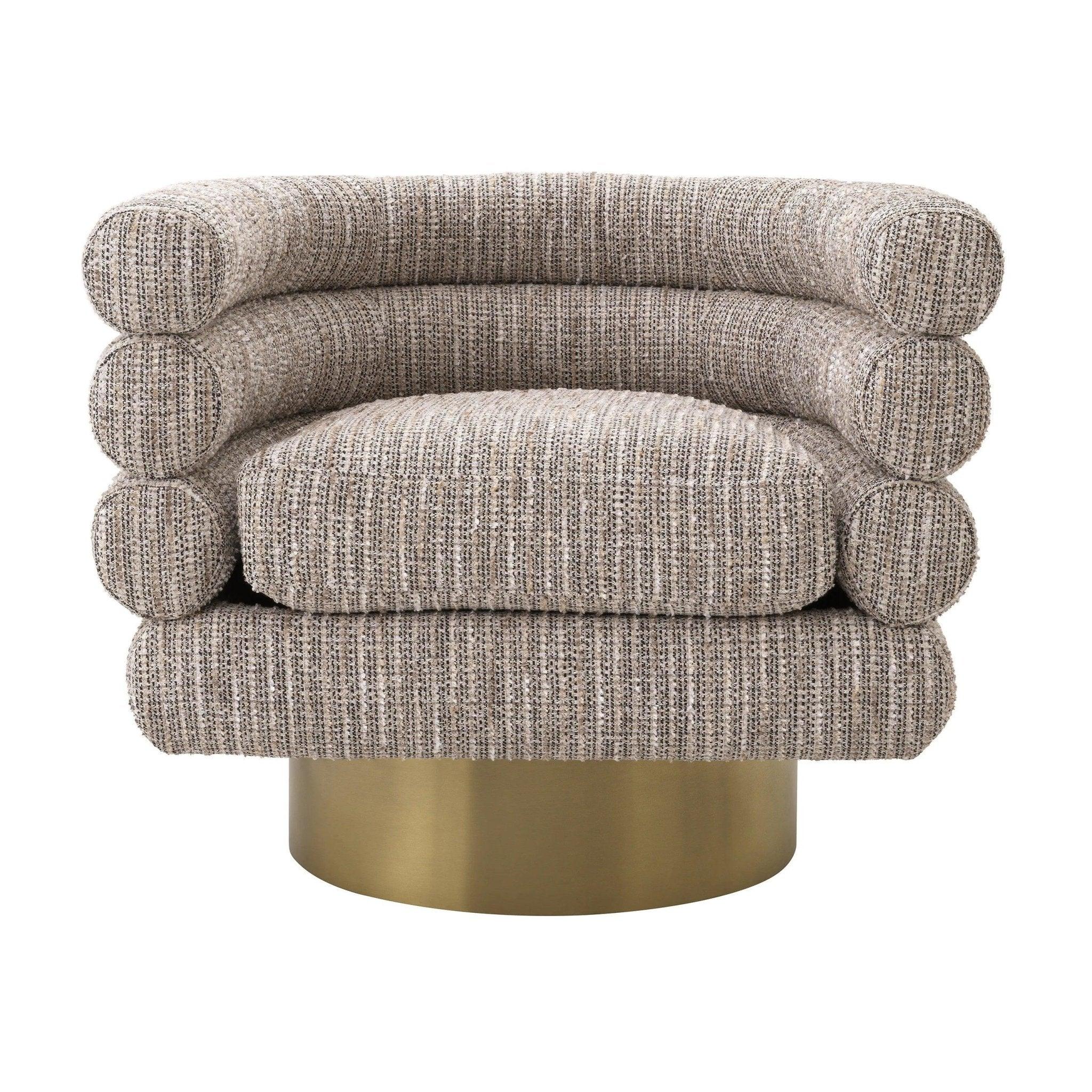 De basis van de beige fauteuil, gemaakt van hoogwaardig geborsteld messing, voegt stevigheid en duurzaamheid toe, terwijl het tegelijkertijd een subtiele toets van industriële charme met zich meebrengt. Messing is een materiaal met een unieke glans en uitzonderlijke duurzaamheid, wat deze fauteuil niet alleen stijlvol, maar ook praktisch maakt.