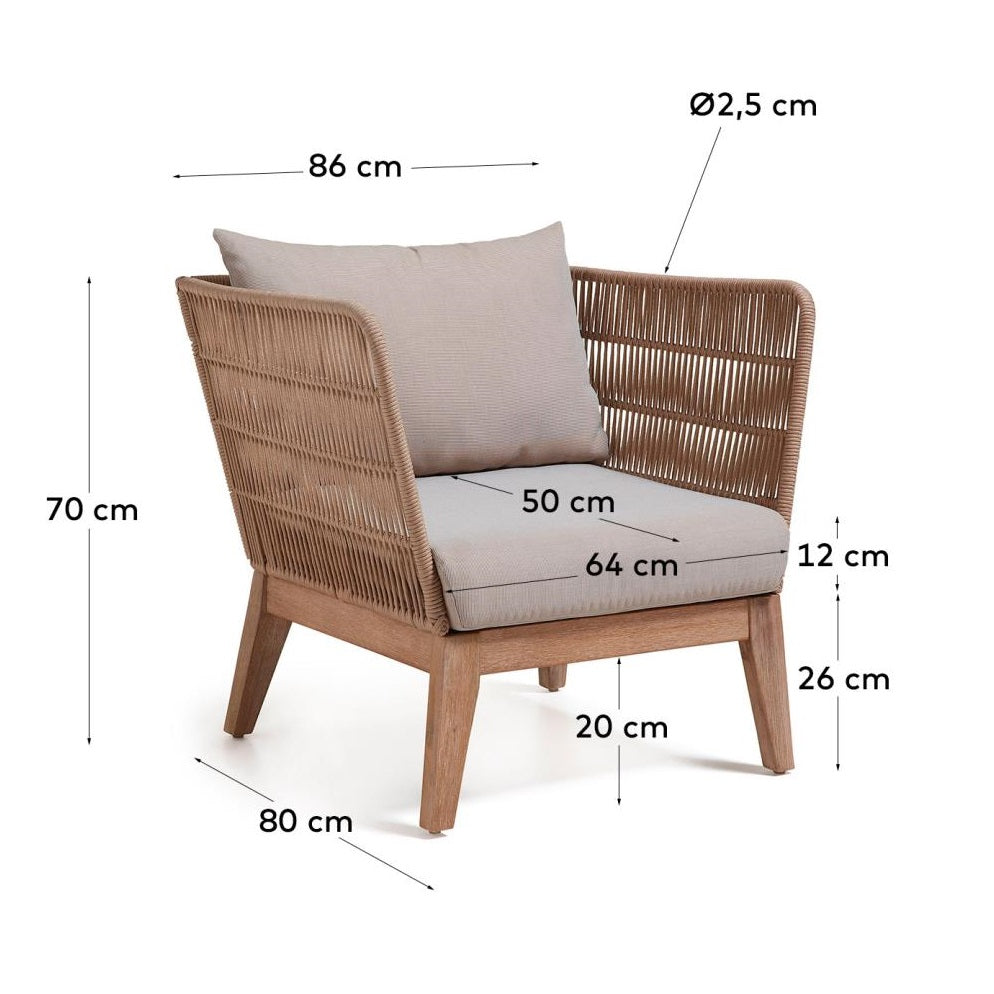 Tuinfauteuil Belleny is ontworpen voor liefhebbers van natuur en elegantie. Gemaakt van massief acaciahout en handgeweven touw, verrast het met zijn stevigheid en unieke stijl. Elk detail van de Belleny fauteuil straalt natuurlijke charme uit, waardoor het een onmiskenbaar karakter toevoegt aan elke buitenomgeving.