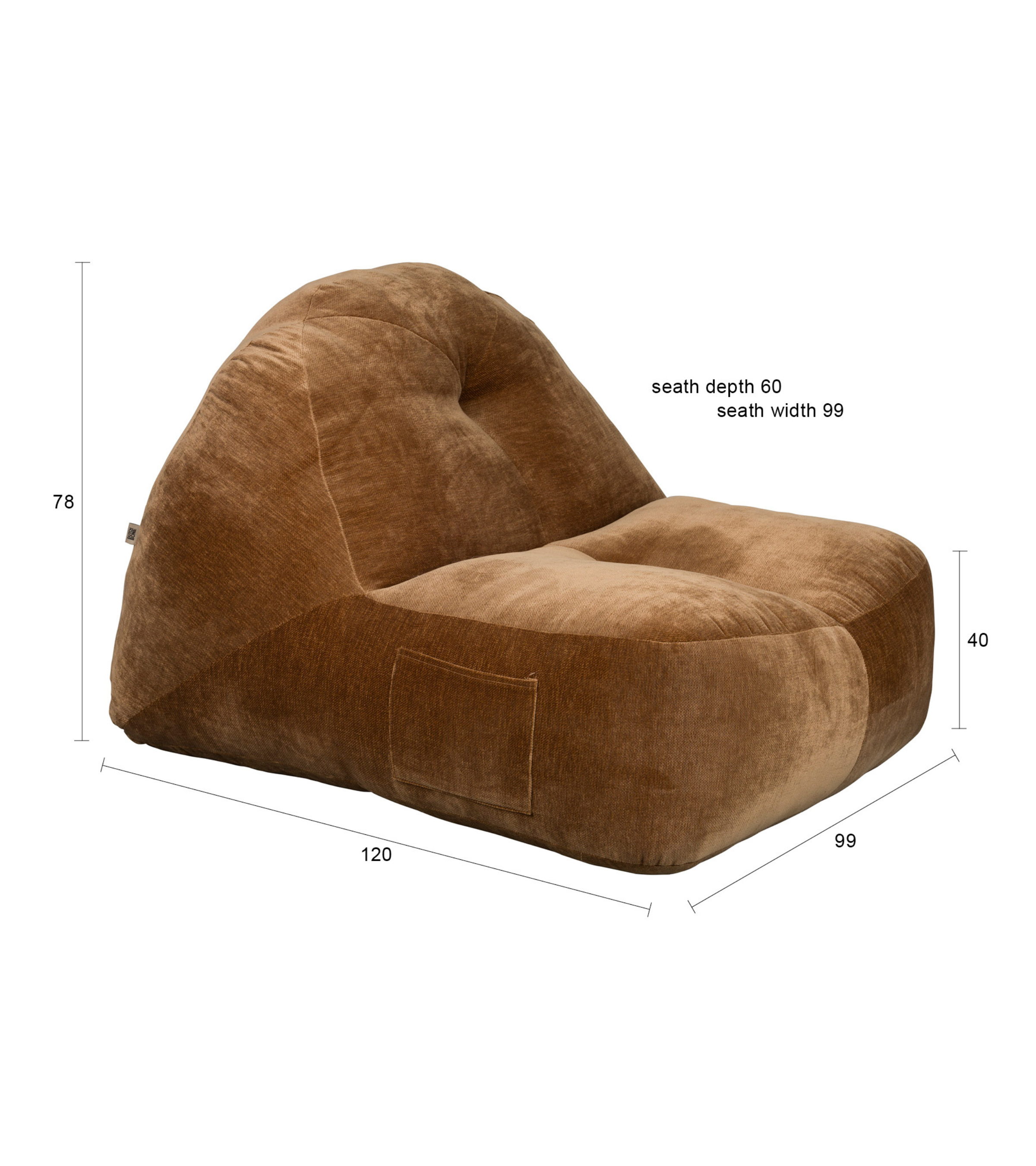 De Tombag fauteuil biedt maximaal comfort en een stijlvolle uitstraling in één. De zachte, fluwelen bekleding in een diepe bruintint verwijst naar de esthetiek van de jaren '70 en brengt gezelligheid en warmte in uw interieur. Perfect voor het creëren van een ontspanningshoekje – ideaal als zitplaats om te lezen, te ontspannen of voor een filmavond.