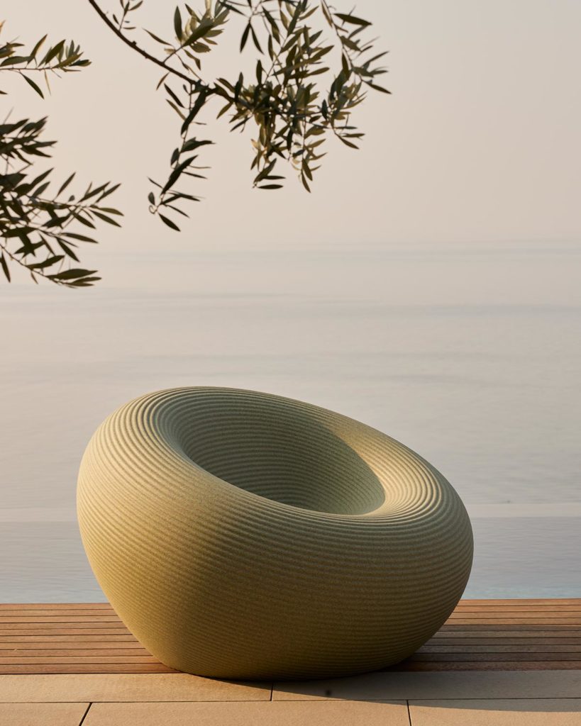 Fauteuil Nami is het resultaat van een draaiing van de sectie rond een diagonale as, wat het een perfect ronde vorm geeft. Langs het oppervlak van de fauteuil lopen gevormde elementen die zich van het centrum naar de randen ontwikkelen in de vorm van een reeks concentrische ringen. In het centrale deel van de fauteuil bevindt zich een kanaal dat de afvoer van water mogelijk maakt. Nami is beschikbaar in zes kleuren, waarvan drie een uniforme tint hebben en de overige drie zijn ontstaan door het recyclen van materialen, waarbij 2-3 verschillende kleurtinten zijn gecombineerd.