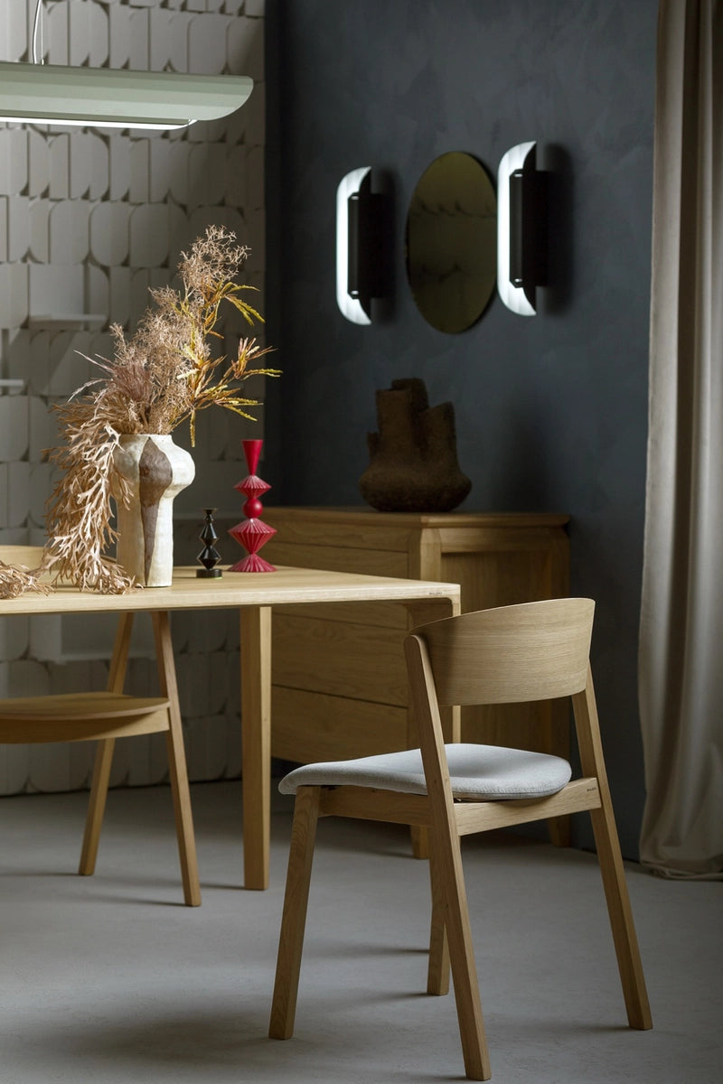 Het gebruik van gereflecteerd licht zorgt ervoor dat de uitgezonden lichtstroom sfeervol en vriendelijk voor de ogen is. Dankzij de ingebouwde LED-module en de mogelijkheid om te bedienen met een afstandsbediening en de Tuya Smart-app, stelt de wandlamp u in staat om de intensiteit en kleur van het licht soepel te veranderen in het bereik van 2700–6500K. De dynamische wijziging van de verlichtingsparameters beïnvloedt ook de waarneming van de kleur van de kap, waardoor de effectiviteit van de contrasterende afwerking wordt benadrukt.