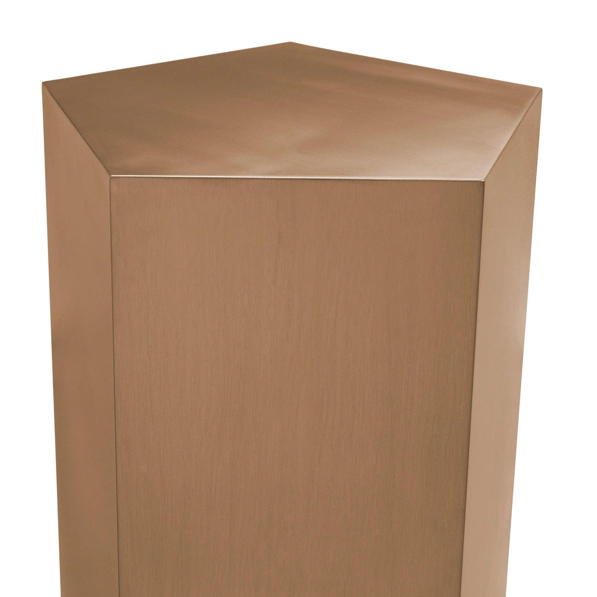 Ontdek de veelzijdigheid van de kolom Meissner - een meubelstuk dat niet alleen glans toevoegt, maar ook een unieke stijl heeft. Dankzij de geometrische vormen en de glanzende afwerking van geborsteld koper, wordt deze design bijzettafel een onmisbaar element in uw interieur.