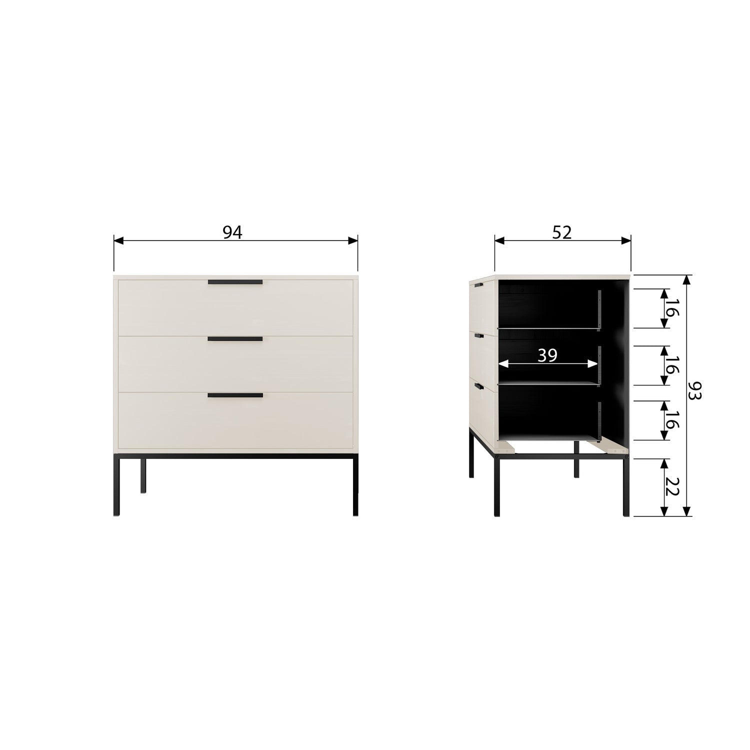 Trzy pojemne szuflady zapewniają mnóstwo miejsca do przechowywania, co czyni komodę idealnym wyborem do sypialni, salonu czy przedpokoju. Stylowe uchwyty oraz stabilna podstawa zostały wykończone matową czarną powłoką proszkową, dodając meblowi nowoczesnego akcentu.