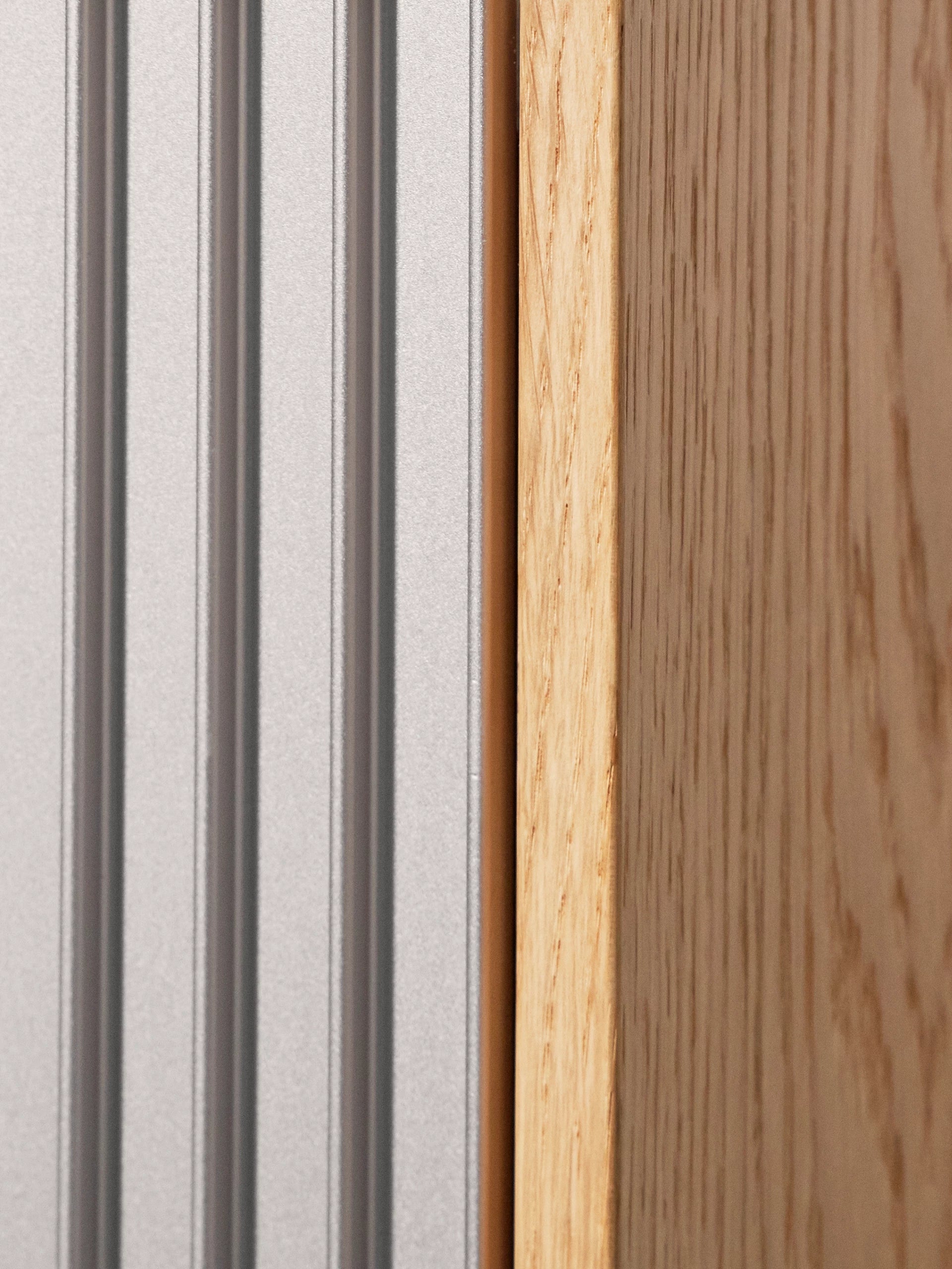 Materiały: Ciemny dąb fornirowany, marmur Pietra Grey, ciemne anodowane aluminium