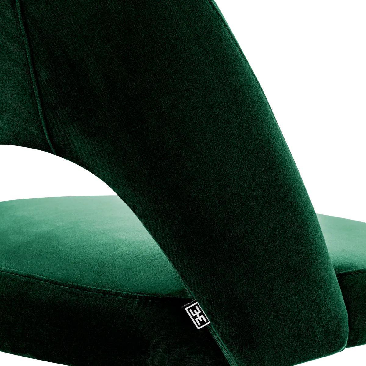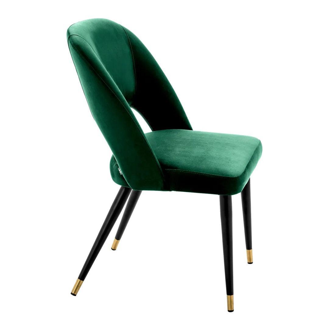 Ożyw swoją jadalnię krzesłem Cipria, które niesie ze sobą ducha stylu lat 50. i współczesne piękno designu. Jego czarne, zwężane nogi ozdobione mosiężnymi akcentami doskonale kontrastują z głębokim zielonym kolorem aksamitnej tapicerki Roche.