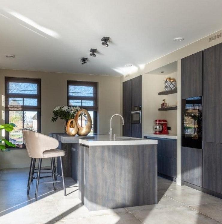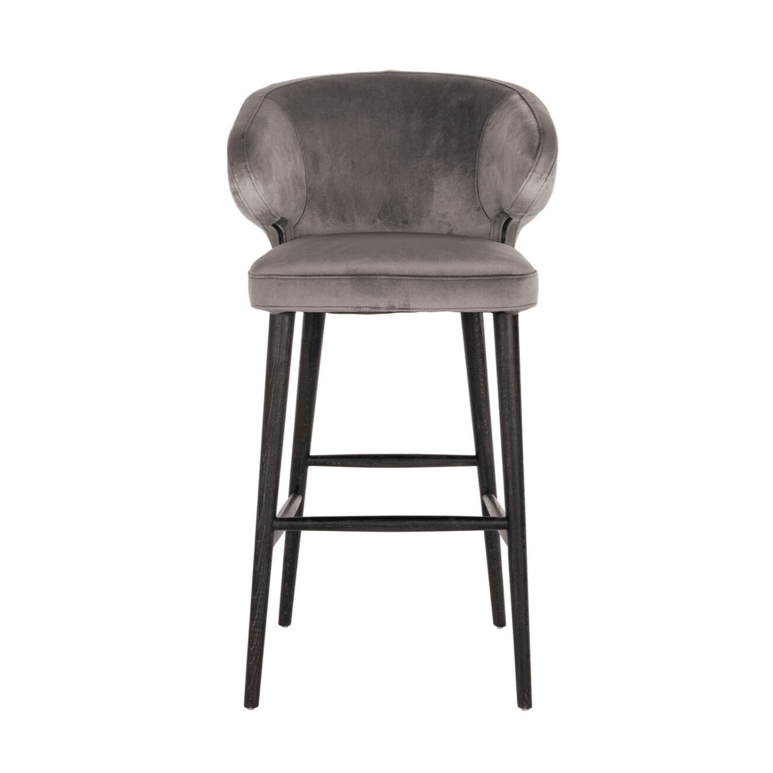 Barstoel Indigo is een meubel met een uniek karakter, dat zich onderscheidt door zijn luxueuze en tijdloze uitstraling. De gevormde rugleuning is gemaakt van fluweel en uiterst comfortabele velours stof in elegante grijstinten. Deze stof geeft de stoel niet alleen esthetische charme, maar biedt ook uitzonderlijk gebruikscomfort.