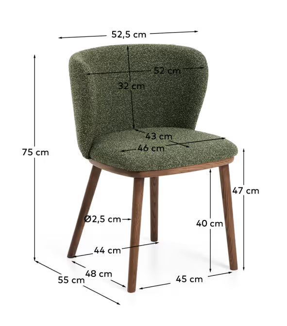 Stoel Ciselia combineert een zachte vorm met een natuurlijke afwerking van hout, waardoor het een harmonieuze en elegante aanvulling op uw interieur vormt. De bekleding van dikke chenille geeft het een aangename, omhullende structuur die warmte en rust in de ruimte brengt. De poten van massief essenhout in een notenhouten kleur benadrukken het tijdloze karakter van het meubel en zorgen voor stabiliteit. Dit is een gestoffeerd model dat perfect tot zijn recht komt aan de eettafel, in de woonkamer of in een open keukenruimte.