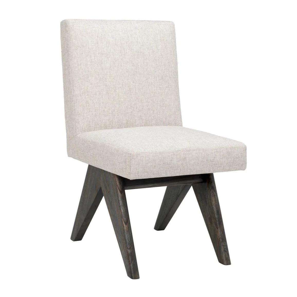 Bij de eerste blik vallen de poten van de stoel op - bruin, stevig en in de vorm van een V. Gemaakt van massief hout, zijn ze niet alleen stabiel, maar voegen ze ook esthetische diepte toe aan het geheel. Hun eenvoudige, maar elegante vorm getuigt ervan dat minder meer is. De zitting van de witte stoel Érudit is omhuld met de natuurlijke stof Loki. De bekleding is niet alleen aangenaam om aan te raken, maar vormt ook een visueel contrast met het houten frame van de stoel, wat hem extra charme geeft.