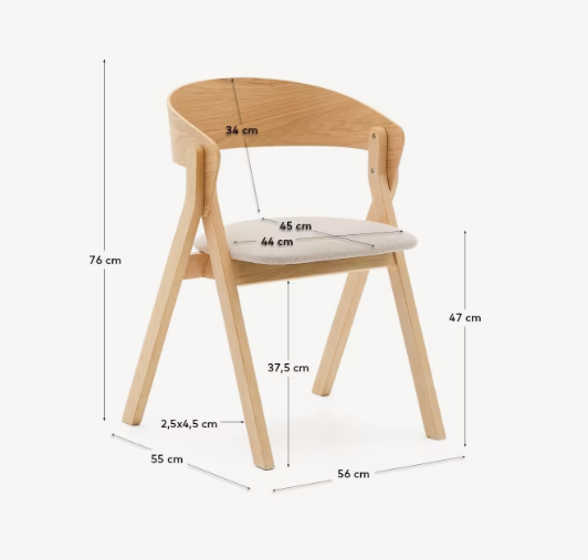 De rugleuning van de stoel is gemaakt van esdoornfineer met een natuurlijke afwerking, wat de tijdloze esthetiek benadrukt. De poten zijn vervaardigd uit massief rubberhout, ook met een natuurlijke afwerking, wat zorgt voor duurzaamheid en stabiliteit. De zitting is bekleed met een beige chenille stof met een delicate structuur, die is gemaakt van gerecycled polyester. Deze stof heeft een certificaat dat het gebruik van gerecycleerde materialen bevestigt, wat de negatieve impact van de productie op het milieu beperkt.
