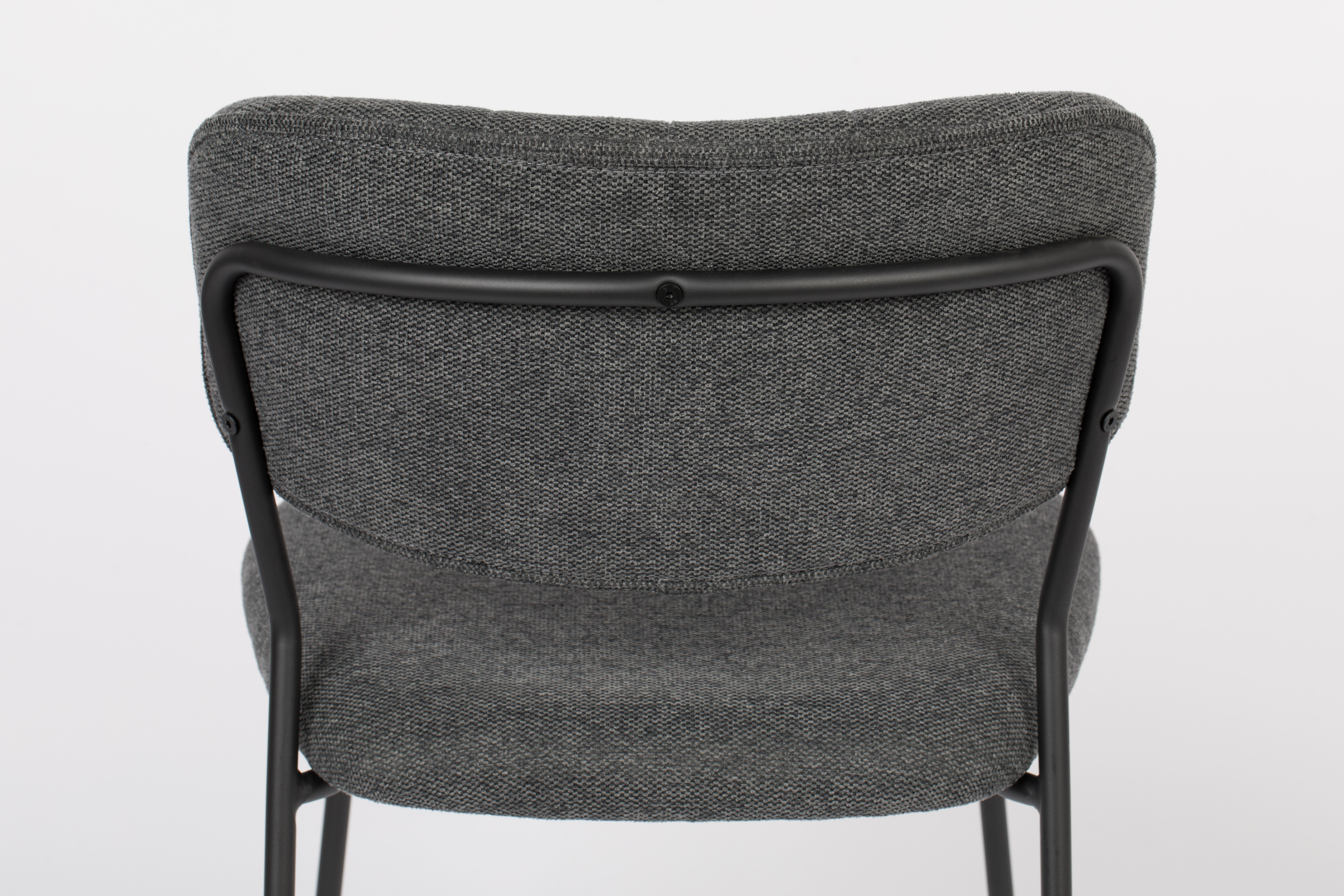 Stoel Jolien is de ideale aanvulling voor een modern ingericht interieur, passend in zowel de eetkamer als de woonkamer of een vrouwelijke werkkamer. De elegantie wordt benadrukt door de zwarte, metalen poten, die stabiliteit bieden en diepte toevoegen. De eenvoudige vorm van de stoel harmoniseert met de donkergrijze bekleding, waardoor het gemakkelijk is om in diverse stijlen te integreren.