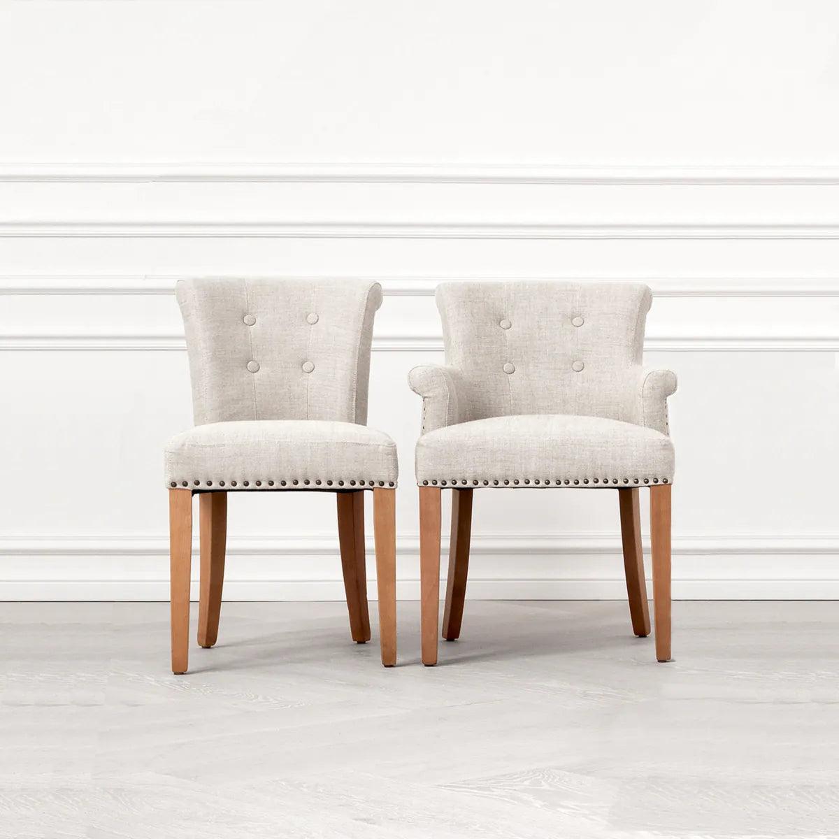 Schuif de Key Largo eetkamerstoel aan de eettafel om te genieten van weelderige diners met vrienden en familie. Deze charmante eetkamerstoel, een moderne variant op de klassieke stijl, met gebroken witte linnen bekleding, antiek bronzen nagels, messing handgrepen en poten van natuurlijk hout, vormt de perfecte aanvulling voor luxe entertainment.