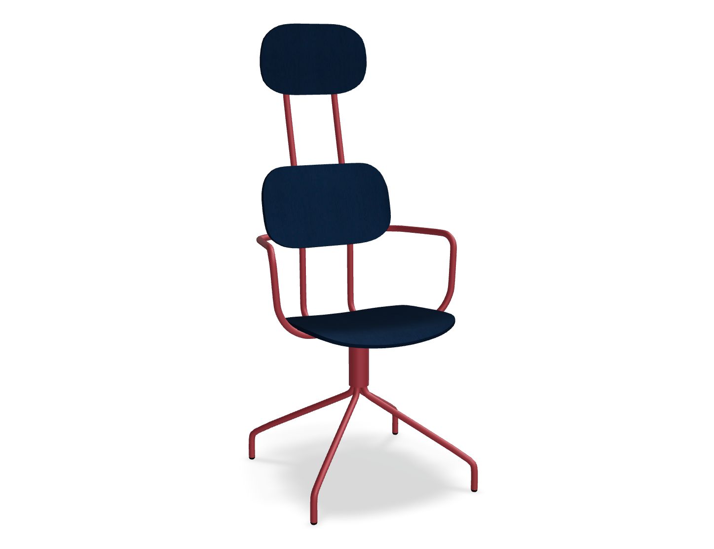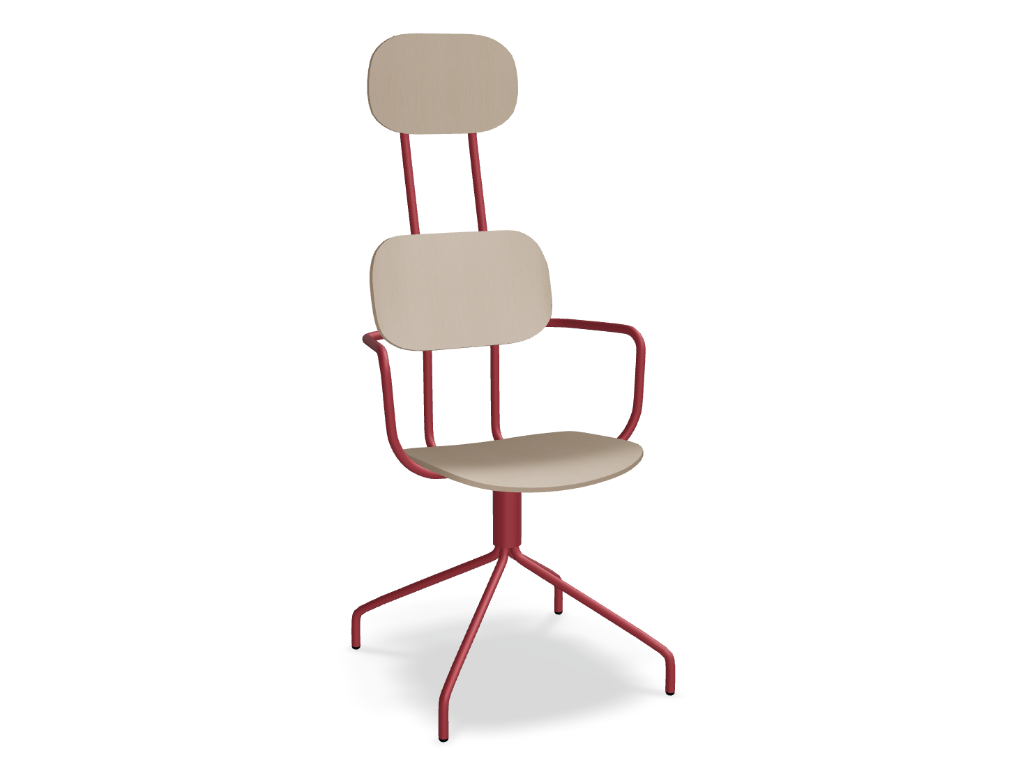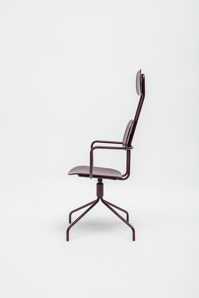 Draaitstoel New School met hoofdkussen, ontworpen door studio Form Us With Love, trekt de aandacht met zijn moderne vorm en dubbele rugleuning. Deze rugleuning benadrukt niet alleen het eigentijdse ontwerp, maar biedt ook uitstekende ondersteuning voor de hele rug. De draaibare basis garandeert vrijheid van beweging, terwijl optionele armleuningen het gebruiksgemak verder verhogen. De versie van multiplex valt op door zijn duurzaamheid en onderhoudsgemak, waardoor het de ideale keuze is voor ruimtes die door veel mensen worden gebruikt.