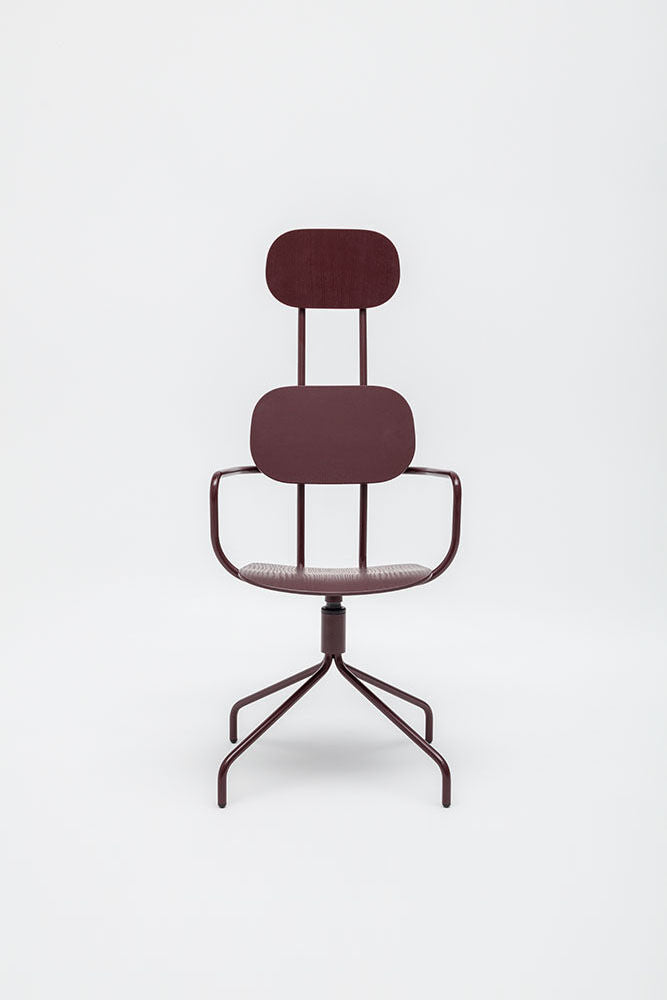 Draaitstoel New School met hoofdkussen, ontworpen door studio Form Us With Love, trekt de aandacht met zijn moderne vorm en dubbele rugleuning. Deze rugleuning benadrukt niet alleen het eigentijdse ontwerp, maar biedt ook uitstekende ondersteuning voor de hele rug. De draaibare basis garandeert vrijheid van beweging, terwijl optionele armleuningen het gebruiksgemak verder verhogen. De versie van multiplex valt op door zijn duurzaamheid en onderhoudsgemak, waardoor het de ideale keuze is voor ruimtes die door veel mensen worden gebruikt.