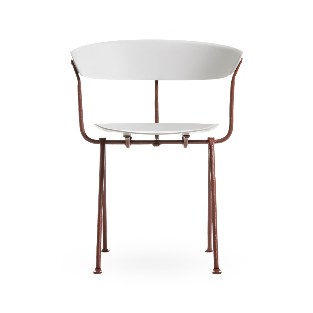 Stoel Officina van het merk Magis, ontworpen door Ronan en Erwan Bouroullec, is een voorbeeld van een perfecte combinatie van minimalistisch design en ambachtelijke precisie. Het frame is gemaakt van gesmeed ijzer – gegalvaniseerd of onderworpen aan kathodische bescherming en poedergecoat – wat de constructie een uitzonderlijke duurzaamheid en een uitgesproken, industrieel karakter geeft.