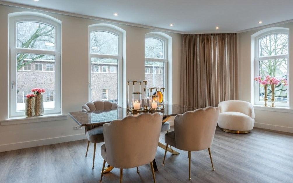 De basis van de stoel, vervaardigd uit roestvrij staal, voegt een unieke glans en elegantie toe aan het geheel. De gouden kleur zorgt ervoor dat de stoel luxe uitstraalt en tegelijkertijd aansluit bij de nieuwste interieurtrends. De metalen basis is niet alleen stabiel en duurzaam, maar geeft de stoel ook een moderne uitstraling, waardoor deze perfect past in verschillende inrichtingsstijlen.
