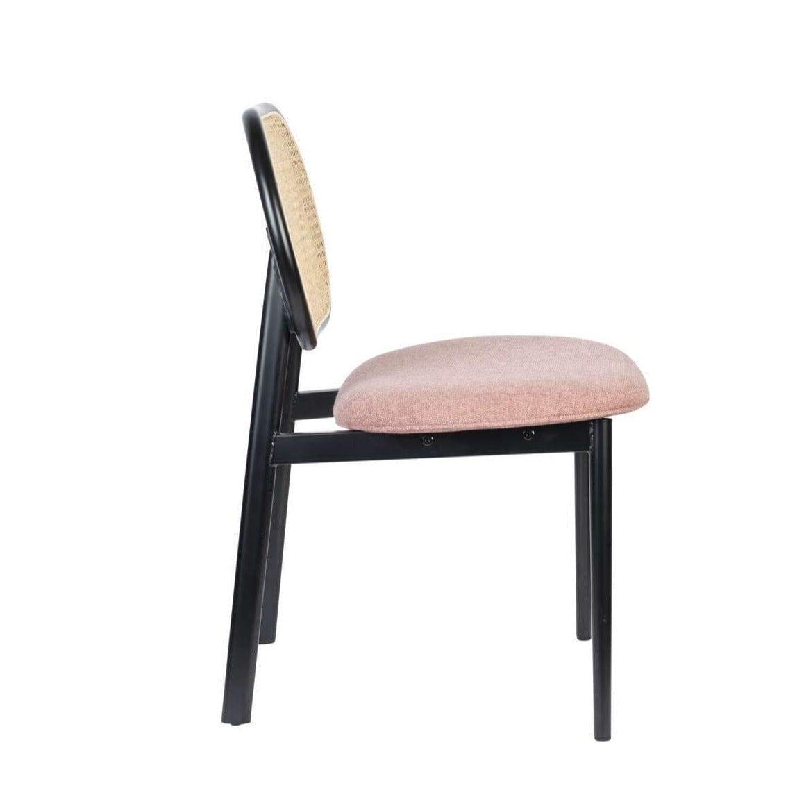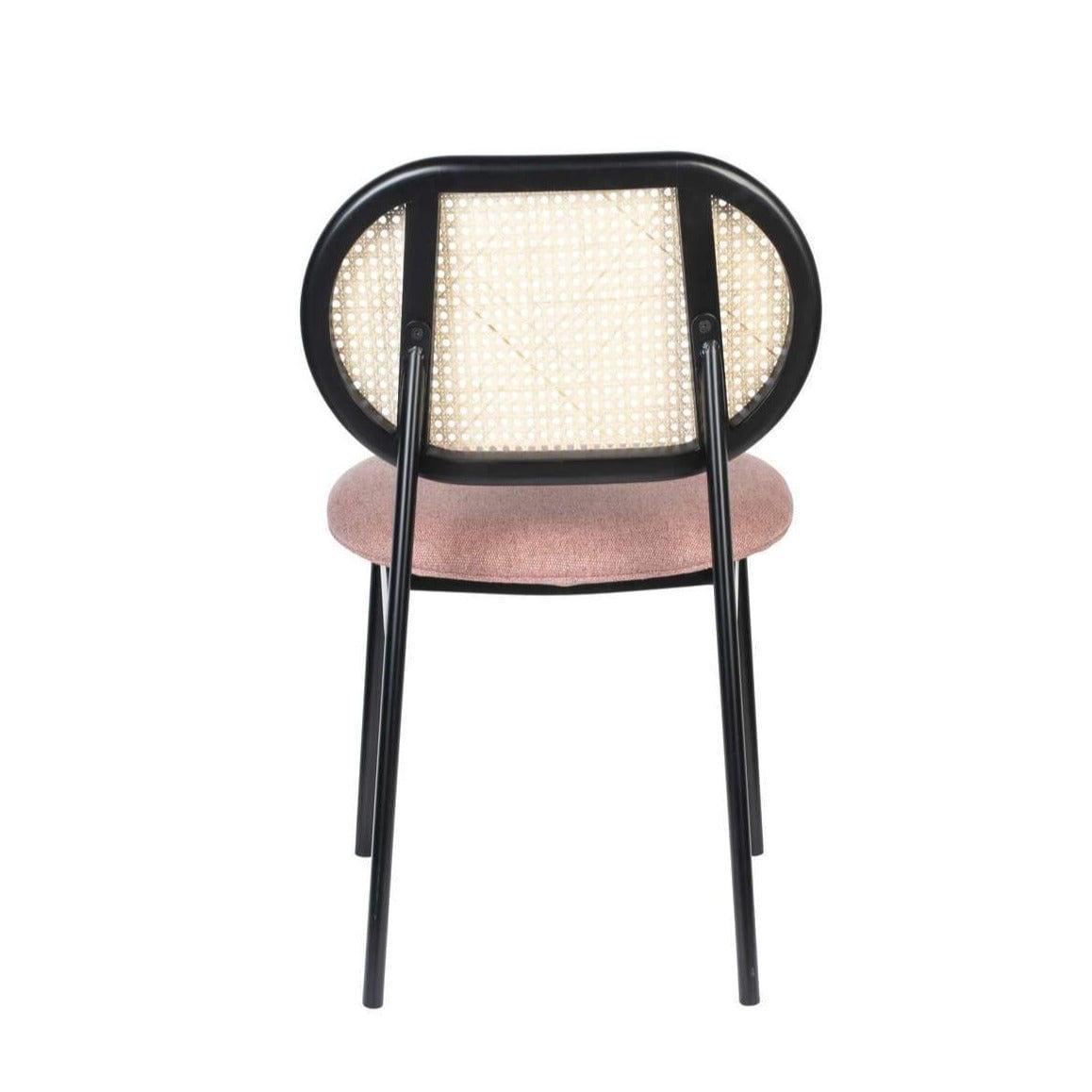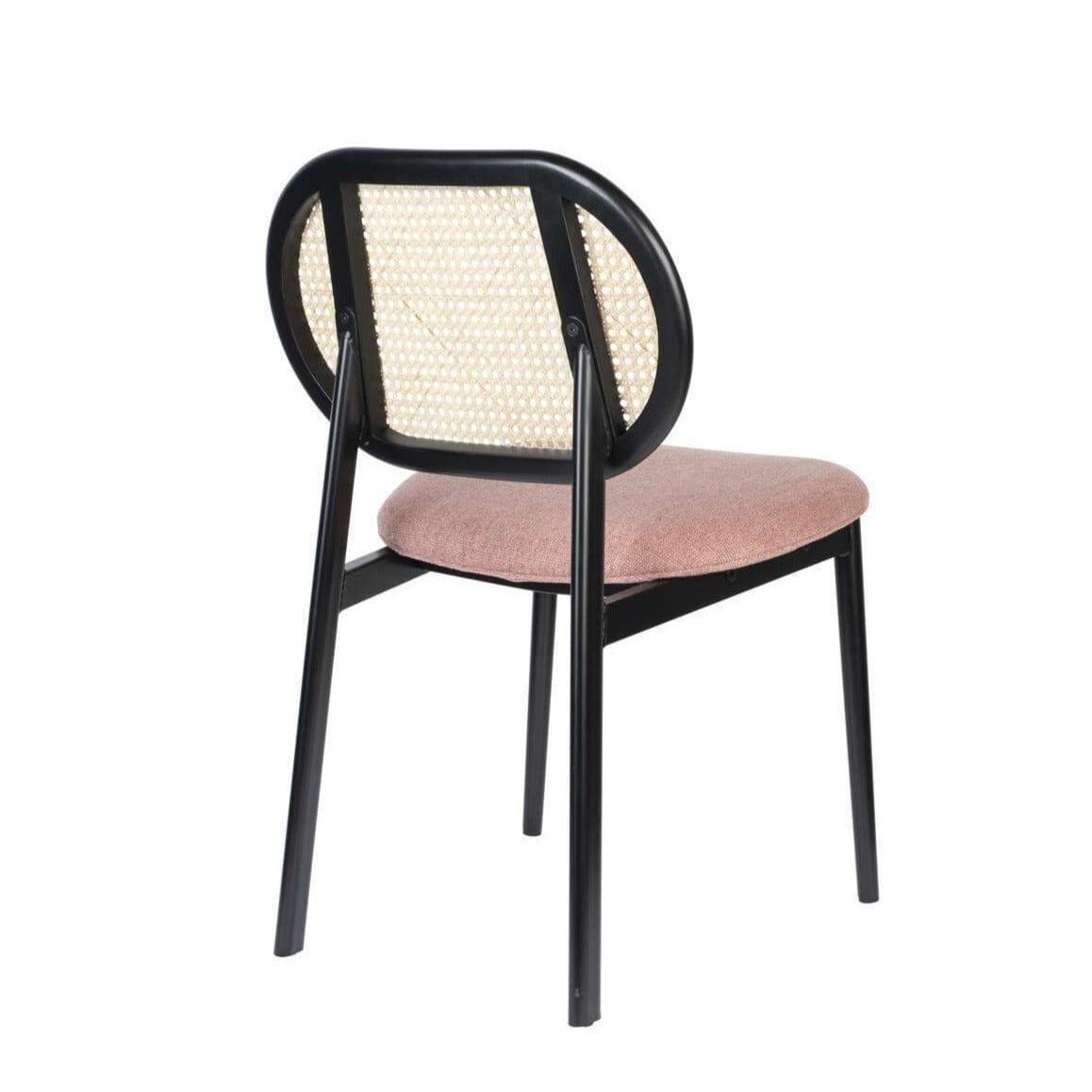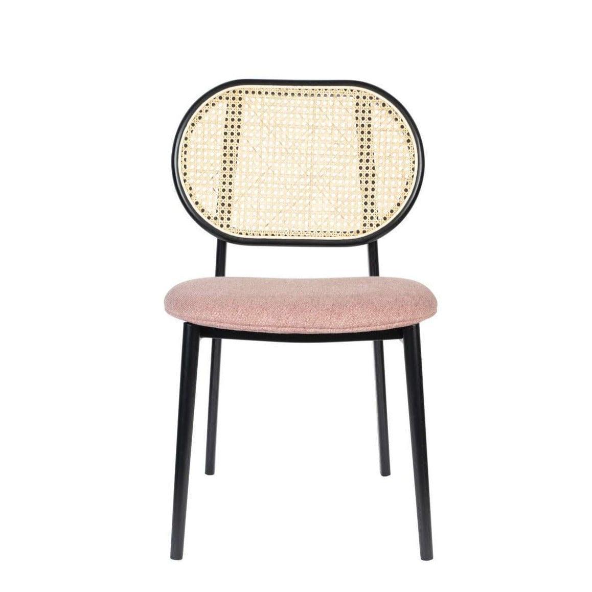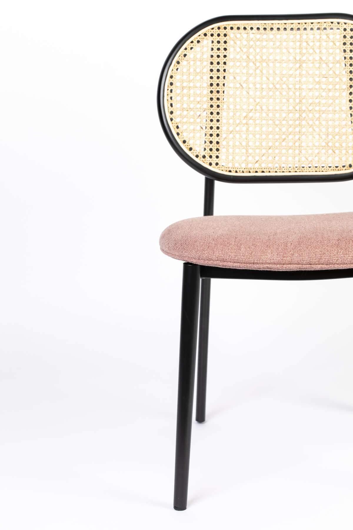 Stoel Spike is een interessante combinatie van retrostijl met boho-elementen. De rieten rugleuning en het minimalistische, elegante frame zijn gecombineerd met een zitting van roze, slijtvast stof. Het geheel ziet er uiterst stijlvol uit en biedt bovendien het juiste comfort tijdens gebruik.
