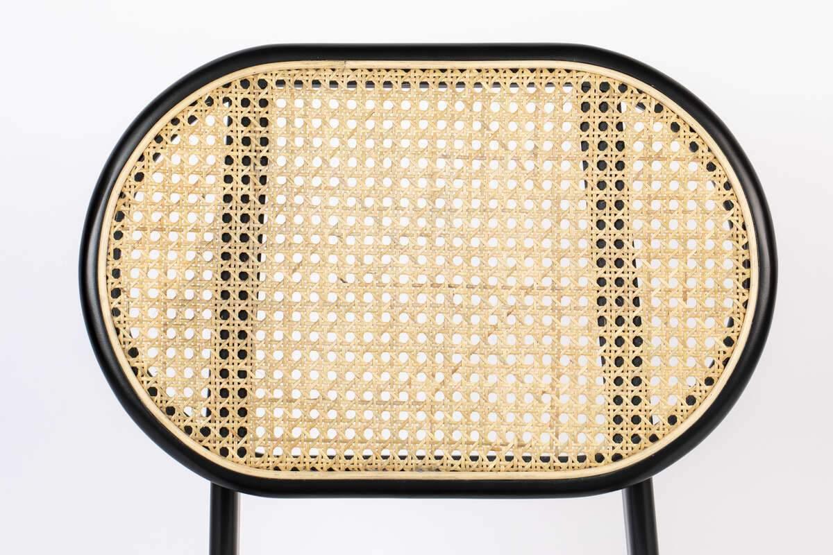 Tył krzesła składa się z rattanu, który został umieszczony w lakierowanej ramie z drewna bukowego. Siedzenie i oparcie ze sklejki wypełnionej pianką PU i obite 100% tkaniną poliestrową. Nogi ze stali malowanej proszkowo z nakładkami PP.