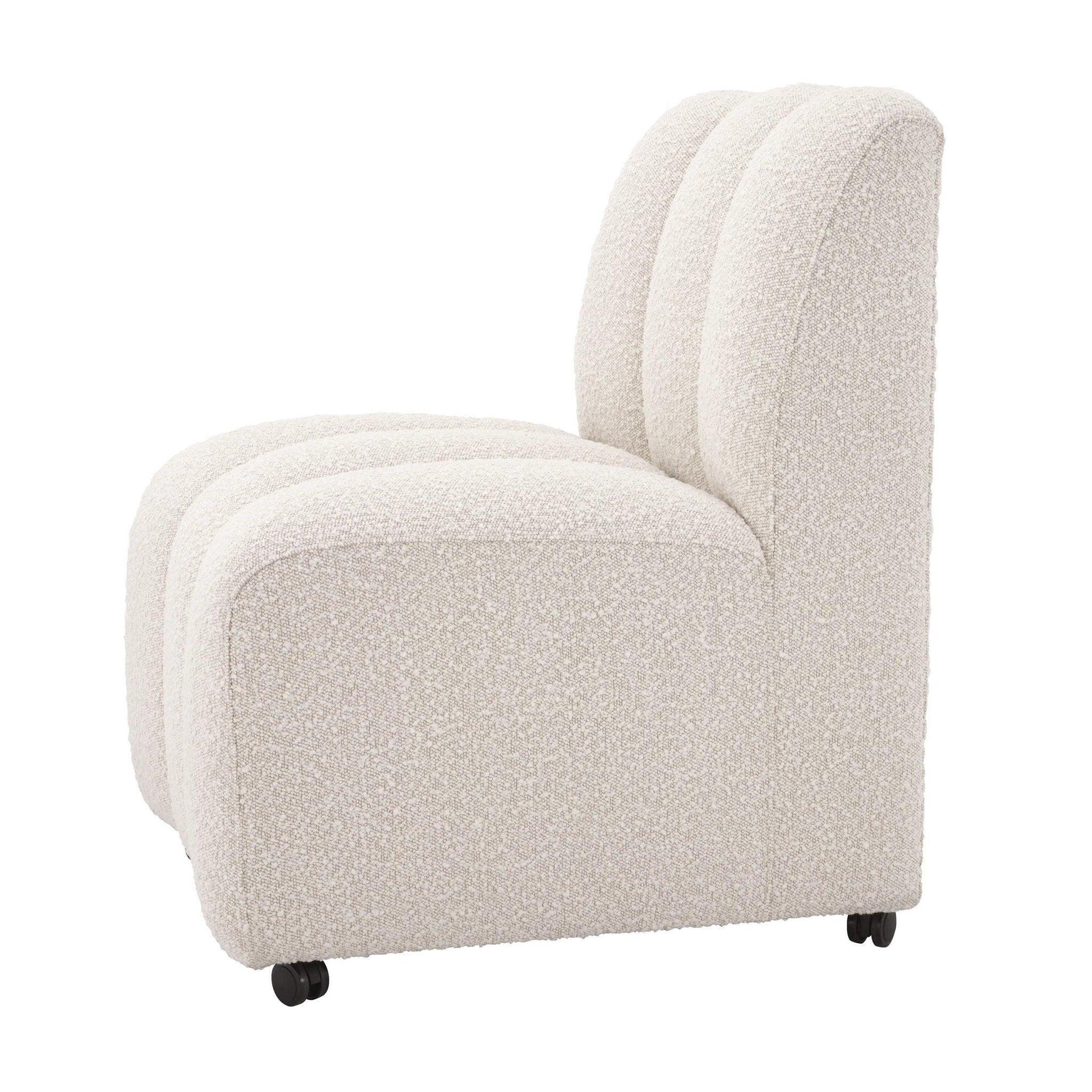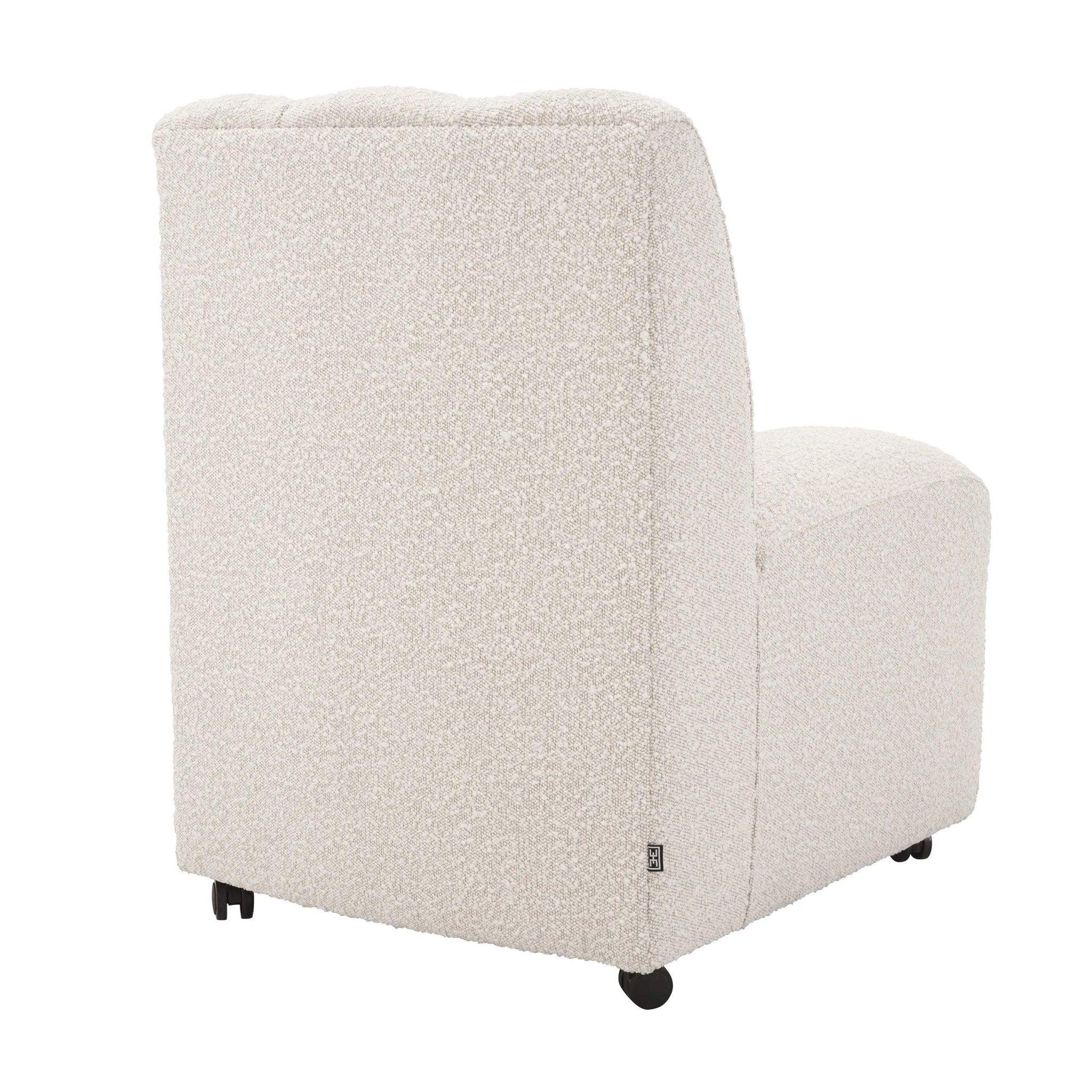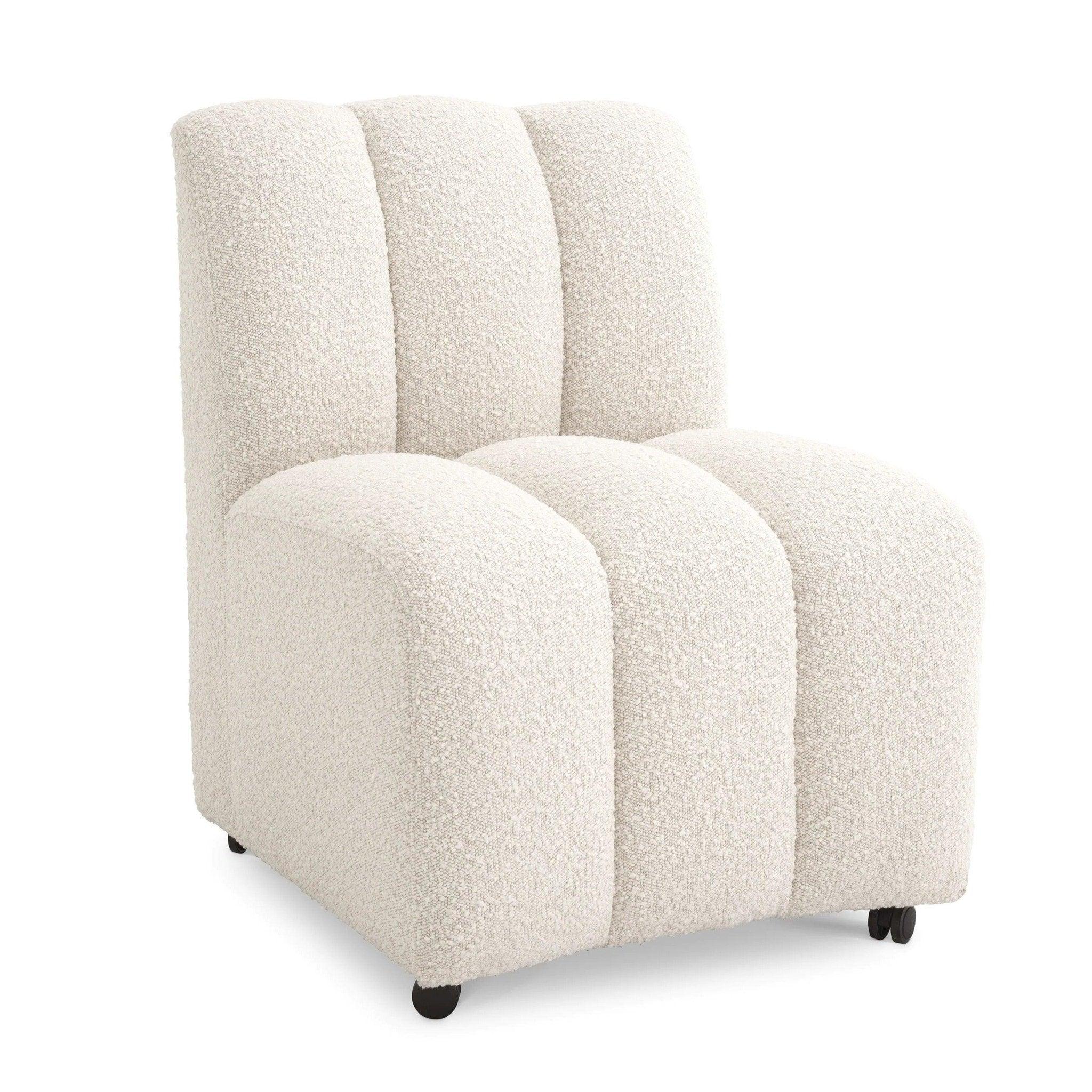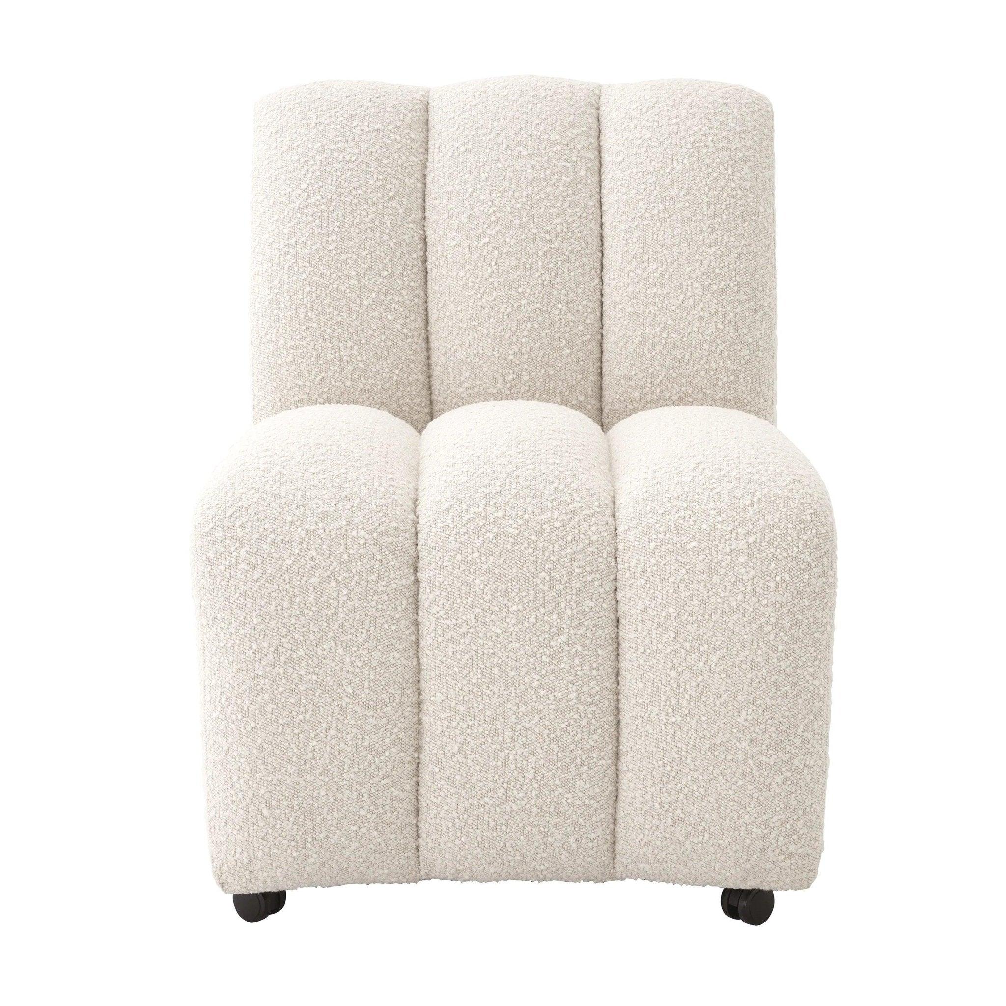 Stel je een rustige middag voor, wanneer de zonnestralen door het raam vallen en een glans creëren op de delicate, crèmekleurige Bouclé stoel van Kelly. De diepe stiksels voegen niet alleen karakter toe, maar vertellen ook het verhaal van het ambacht en de precisie waarmee het is gemaakt. Deze zorgvuldige details creëren het perfecte decor voor elk diner, of het nu een romantisch diner voor twee is of een familiefeest.