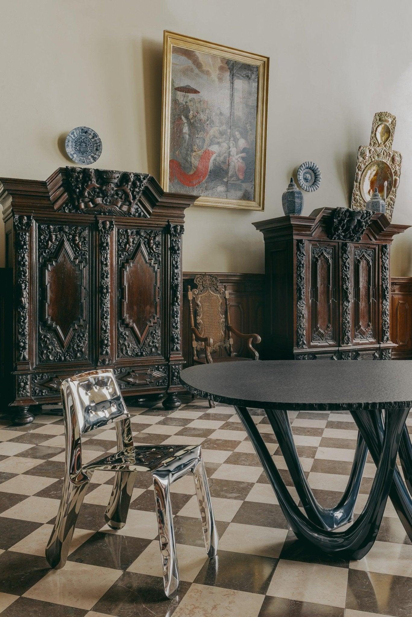 Het ontdekken van de stoel is als een heerlijke aanraking met magie. Het is de combinatie van de ijzige kracht van staal met de zachtheid van artistieke vervorming. Het is een uniek kunstwerk dat zich losmaakt van sjablonen en een uitdrukking van uniciteit wordt. De stoel neemt ons mee naar de grens tussen realiteit en fantasie, waar kou en warmte, ruwheid en tederheid, samensmelten tot één, en een onvergetelijk beeld creëren.