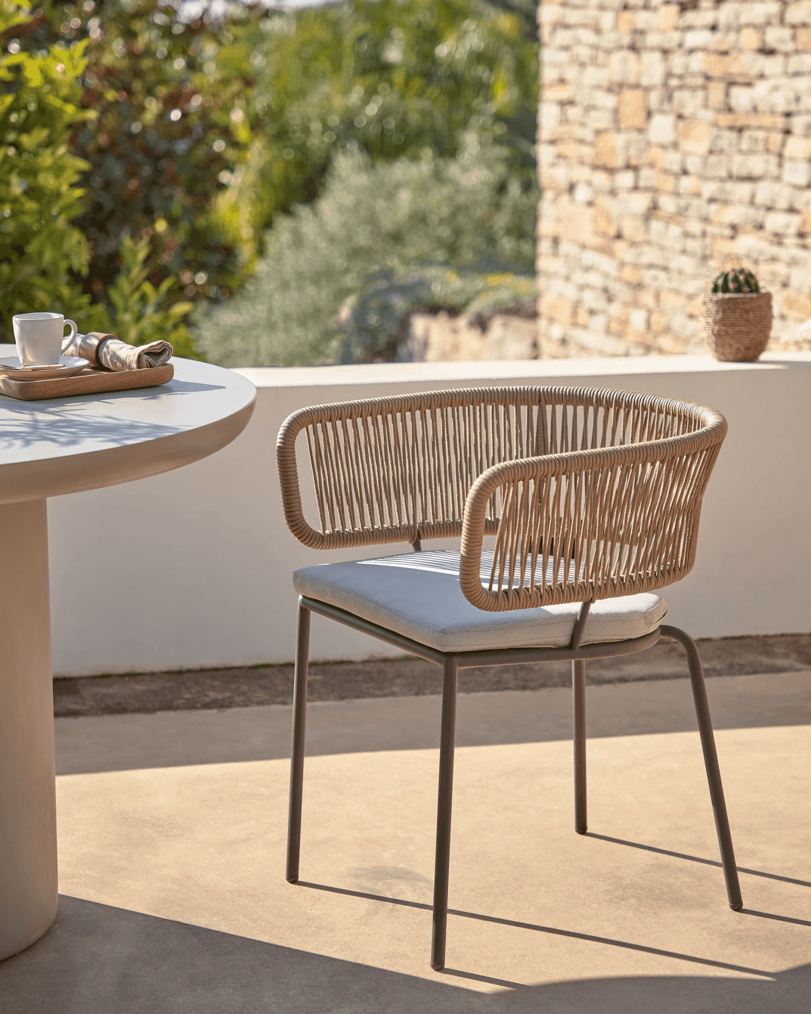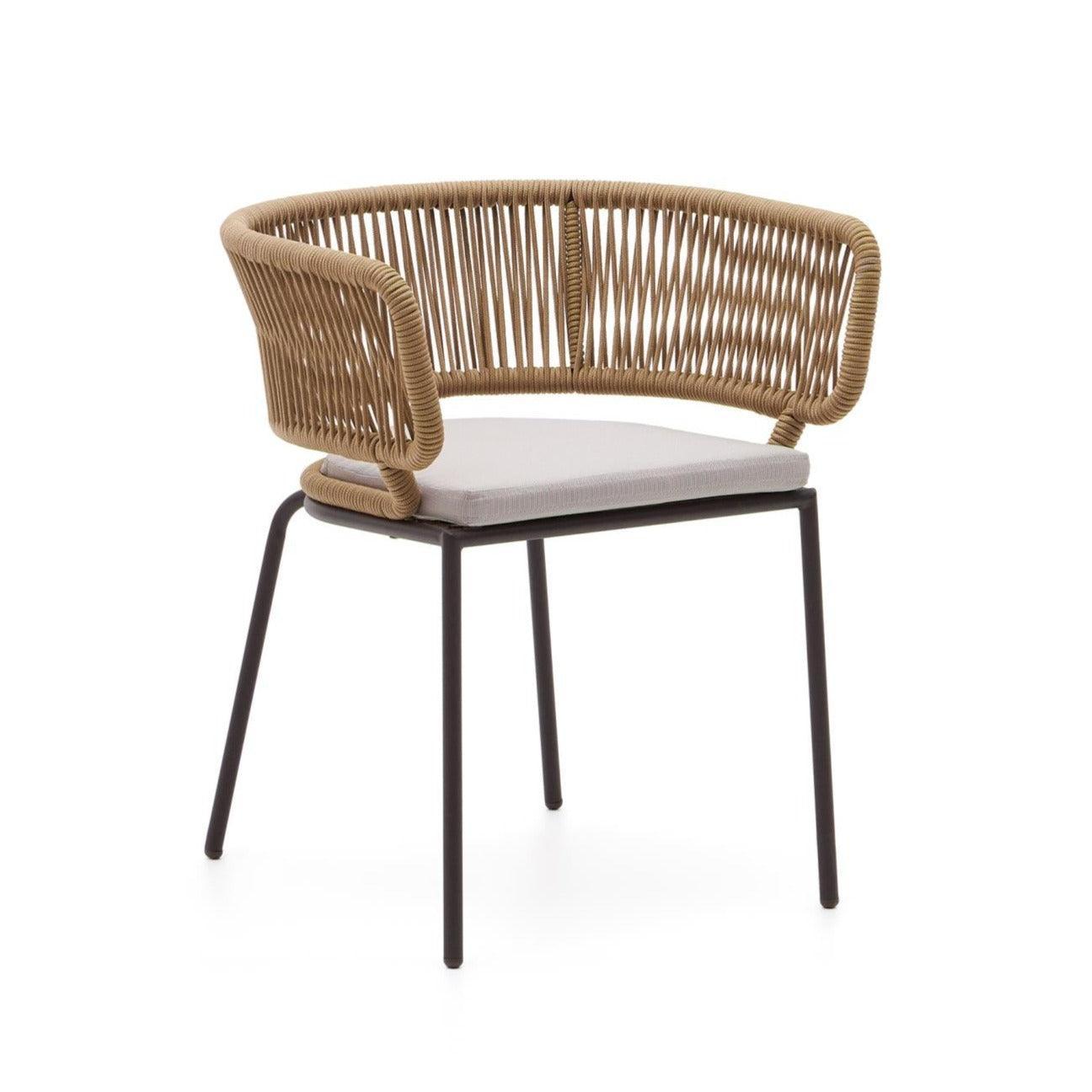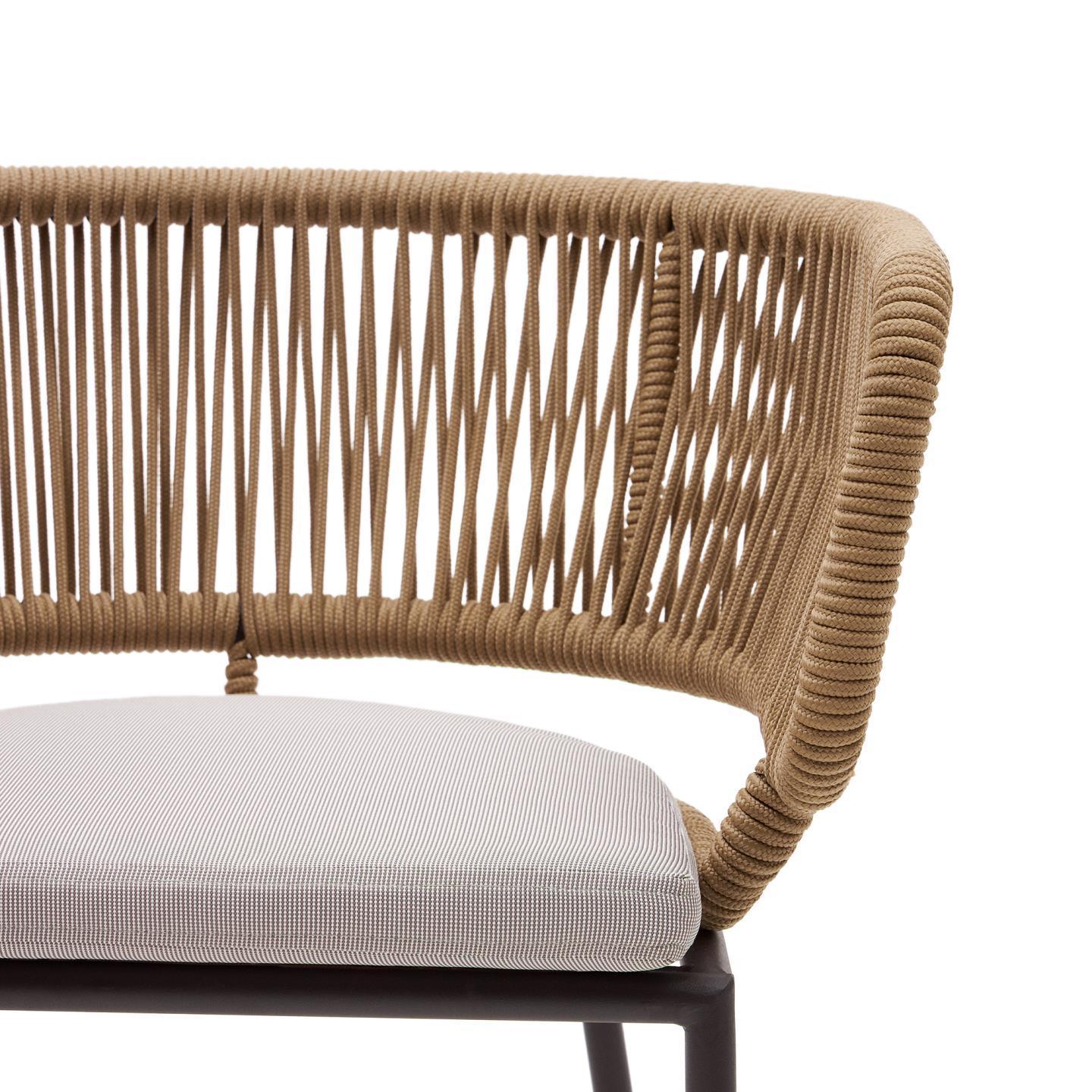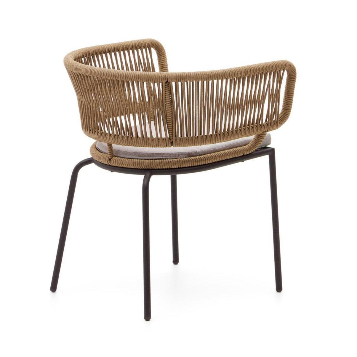 De uniciteit van de stoel Nadin ligt in de handgemaakte basis van band en de rugleuning van touw, wat het een bijzonder karakter geeft en ervoor zorgt dat elk exemplaar uniek is. De handgeweven omhulsel van touw is een uitdrukking van ambachtelijke tradities die door de tijd heen worden doorgegeven, waardoor het meubel niet alleen functionaliteit, maar ook een ziel krijgt.