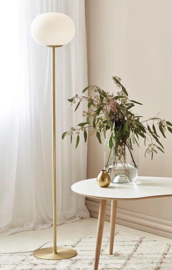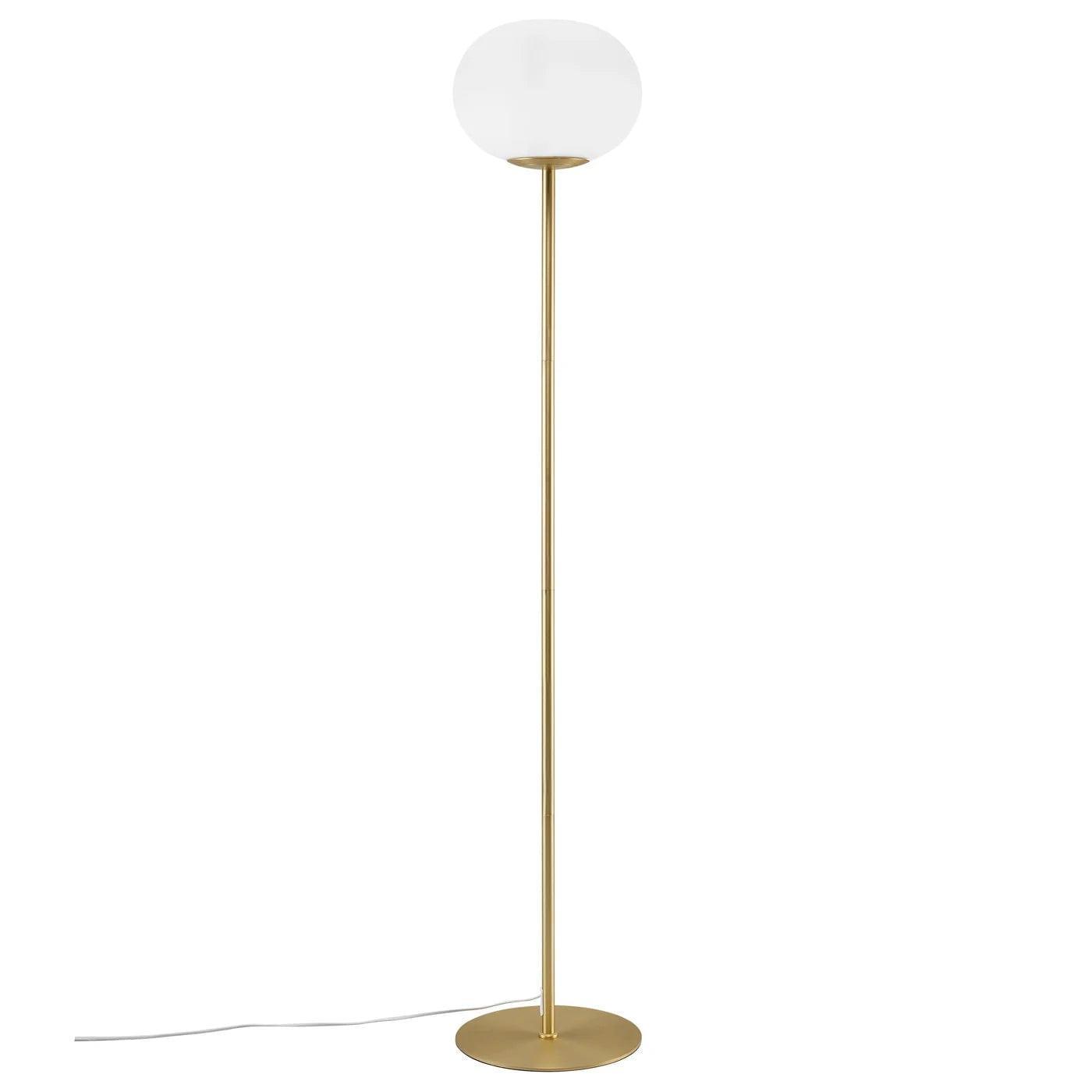 Vloerlamp Alton, die een prachtige samenhang biedt tussen wit glas en de charmante, afgeronde vorm van de voet, vormt een elegante aanvulling voor de woonkamer of eetkamer. De combinatie van iriserend glas en geborsteld messing creëert een gezellige, maar tegelijkertijd moderne uitstraling. Deze gouden vloerlamp voegt een tijdloze en verfijnde uitstraling toe aan uw interieur.