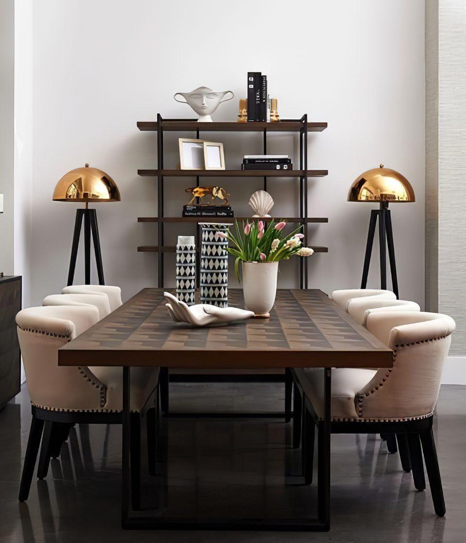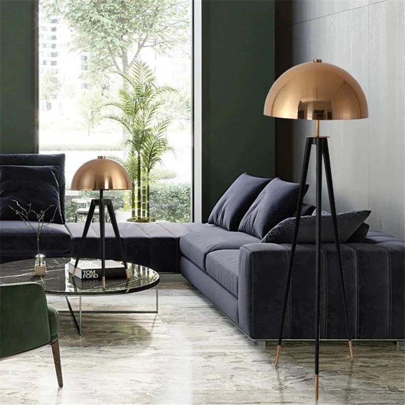 Vloerlamp Coyote is de belichaming van de Mid-Century Modern stijl, die elke ruimte een gezellige sfeer en verfijnd design toevoegt. De gouden afwerking van de koepelvormige kap geeft de lamp elegantie, terwijl de zwarte taps toelopende poten met messing accenten een subtiel contrast creëren, wat resulteert in een harmonieuze en moderne uitstraling.