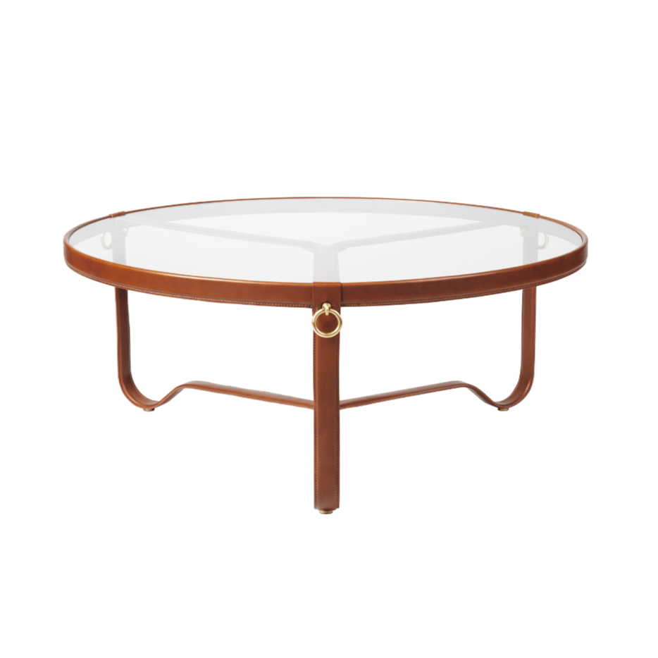 ADNET glazen en bruin leren salontafel