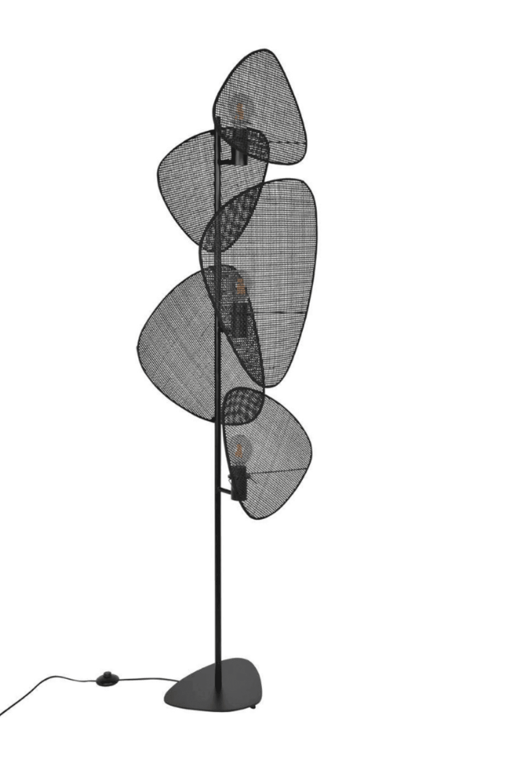 Vloerlamp Screen in de kleur zwart presenteert zich als een indrukwekkende driepunt vloerlamp, die functionaliteit combineert met verfijnde stijl. Het heeft een stevige, geschilderde metalen voet die stabiliteit en een elegante uitstraling biedt. Een belangrijk element van de lamp is de kap, bestaande uit vijf schermen gemaakt van riet.