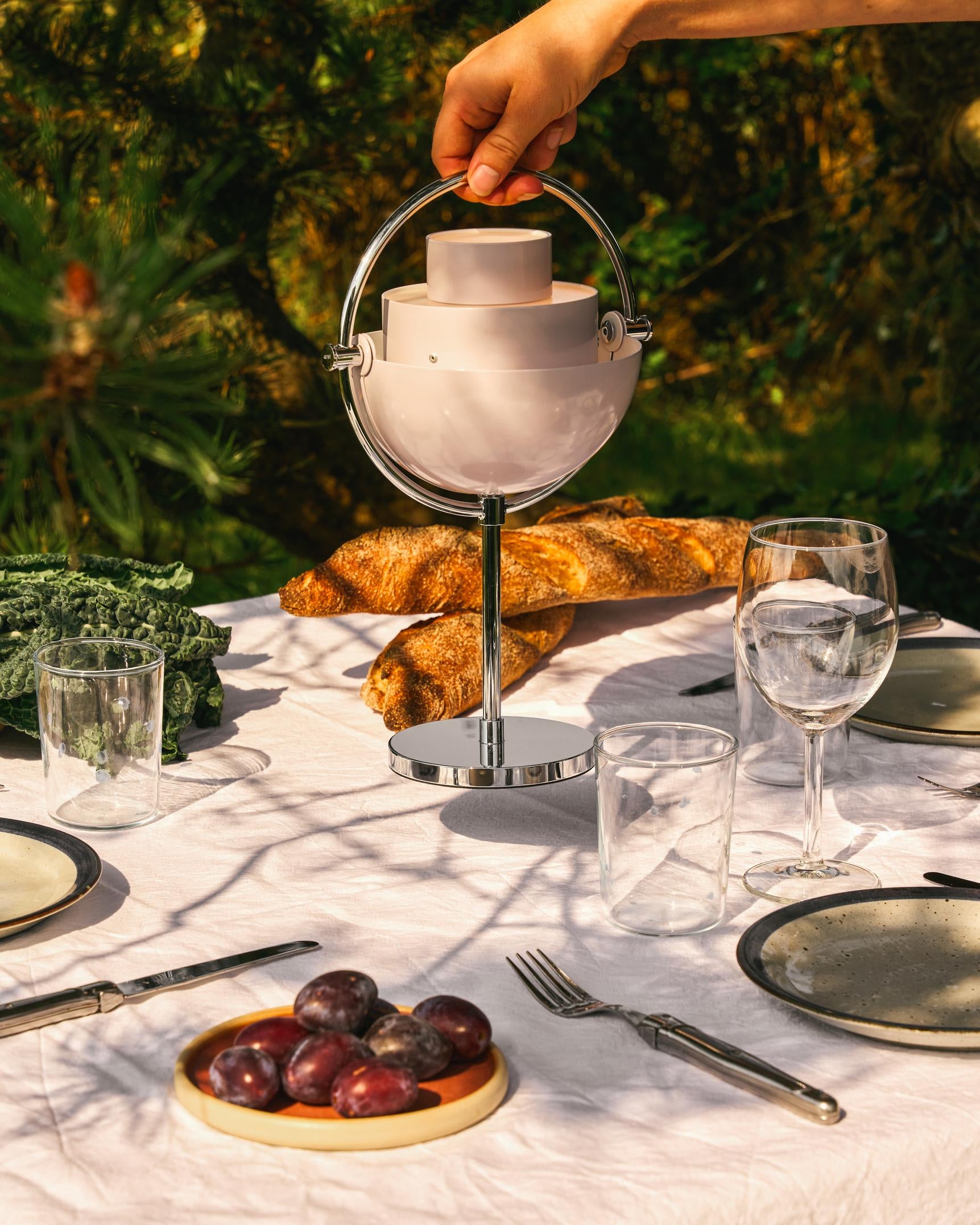 De draagbare versie heeft zijn herkenbare, modulaire lampenkap behouden, die kan worden gedraaid om het licht nauwkeurig te richten. Nieuwe, glanzende afwerkingen in vier kleuren geven de lamp een uitgesproken karakter en maken het gemakkelijk om deze aan te passen aan verschillende interieurstijlen – van klassiek tot modern en buiten. De lamp straalt zacht, diffuus licht uit, perfect voor het creëren van sfeer – in de woonkamer, op het terras of tijdens avonden met een glas wijn.