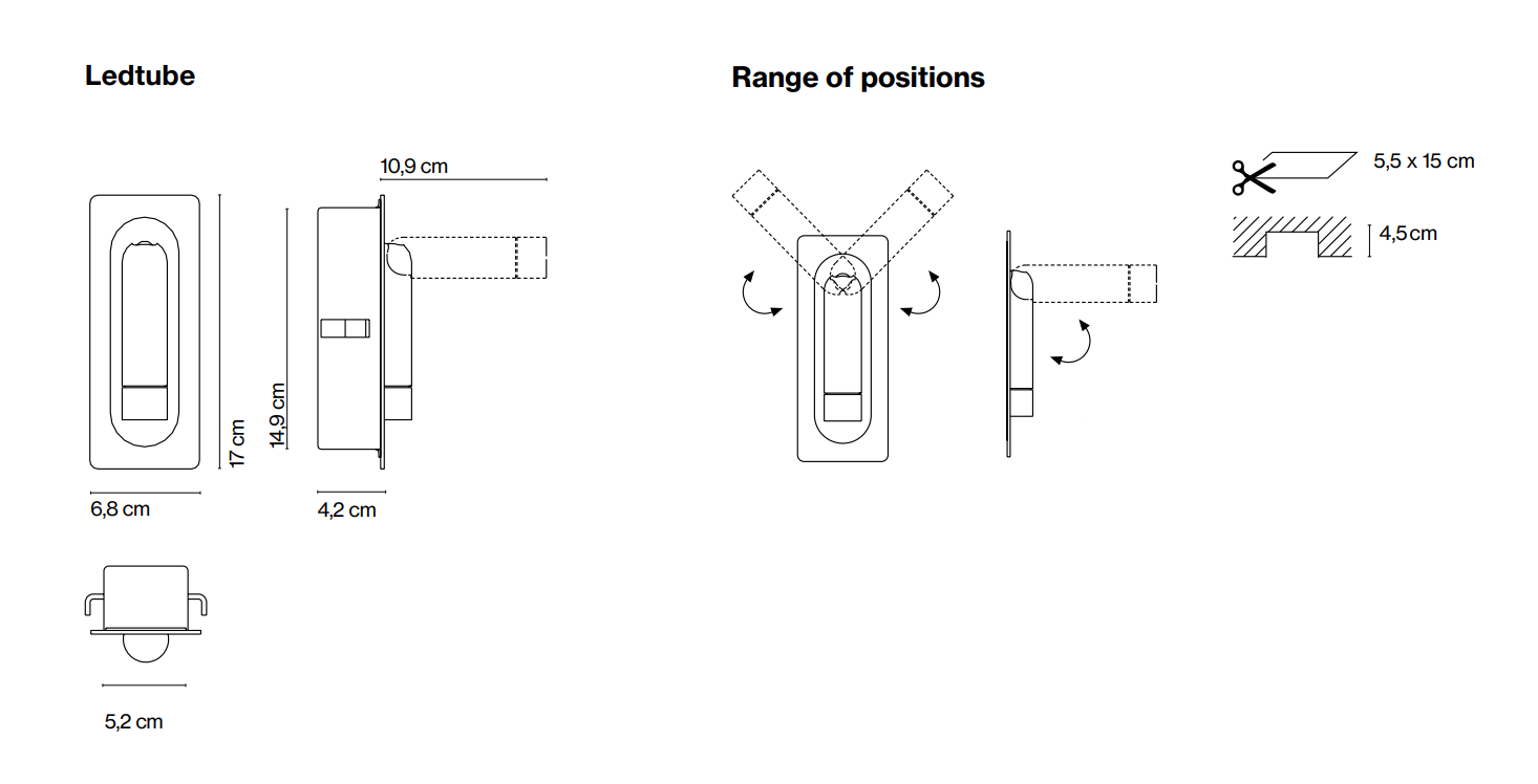 Het ergonomische ontwerp maakt het mogelijk om de lamp in elke richting te draaien, tot 360º, en de bediening is zeer intuïtief. Bij het openen schakelt hij automatisch in; bij het sluiten schakelt hij uit en verdwijnt in de muur, als een camouflage. Hij is zo veelzijdig dat hij zowel verticaal als horizontaal kan worden geïnstalleerd, zich aanpassend aan de behoeften van de ruimte.